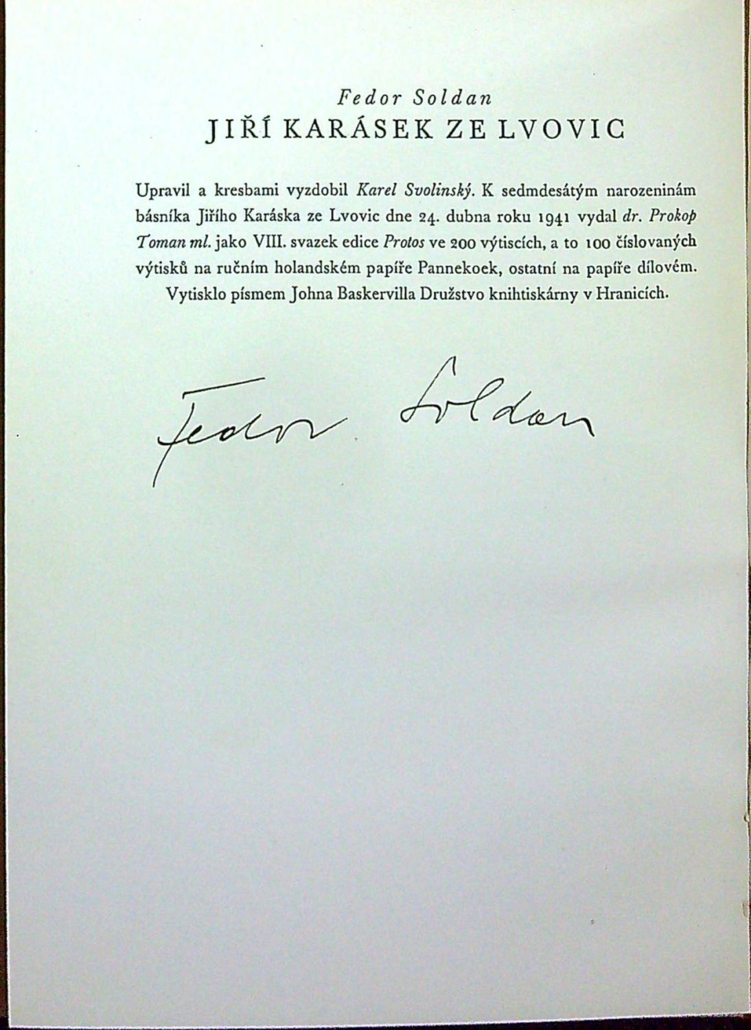 Jeden ze sta exemplářů tištěných na papíře dílovém (krom toho bylo 100 ex. vytištěno na Pannekoeku a číslováno). V tiráži podpis autorův. Dobová plátěná vazba, na přední desce tlačený a zlacený název, na předním přídeští dřevorytové ex libris pro V.P.