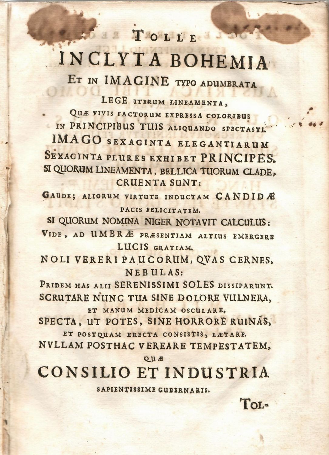 IMAGO PRINCIPUM BOHEMIAE LXI. ELOGIIS DUCUM, REGUM, INTERREGUM, ADUMBRATA, In novum Patriae splendorem, & publicum Regni decus, spectatum proposita AB ... DOMINO MICHAELE FRANCISCO FERDINANDO S.R.I. COMITE AB ALTHANN: [rub tit. listu] CUM In antiquissima & celeberrima Universitate Carolo/Ferdinandea Pragensi PRAESIDE ... P. JOANNE HABELIO e SOCIETATE JESU, AA. LL. & PHILOSOPHIAE DOCTORE, Ejusdémque in aedem Universitate Professore Ordinario, Pro prima Philosophiae Laureae PHILOSOPHIAE RATIONALIS ASSERTIONES propugnaret IN AULA CAROLINA Anno a partu Virginis M.DC.LXXIII [= 1673]. Mense Die ...