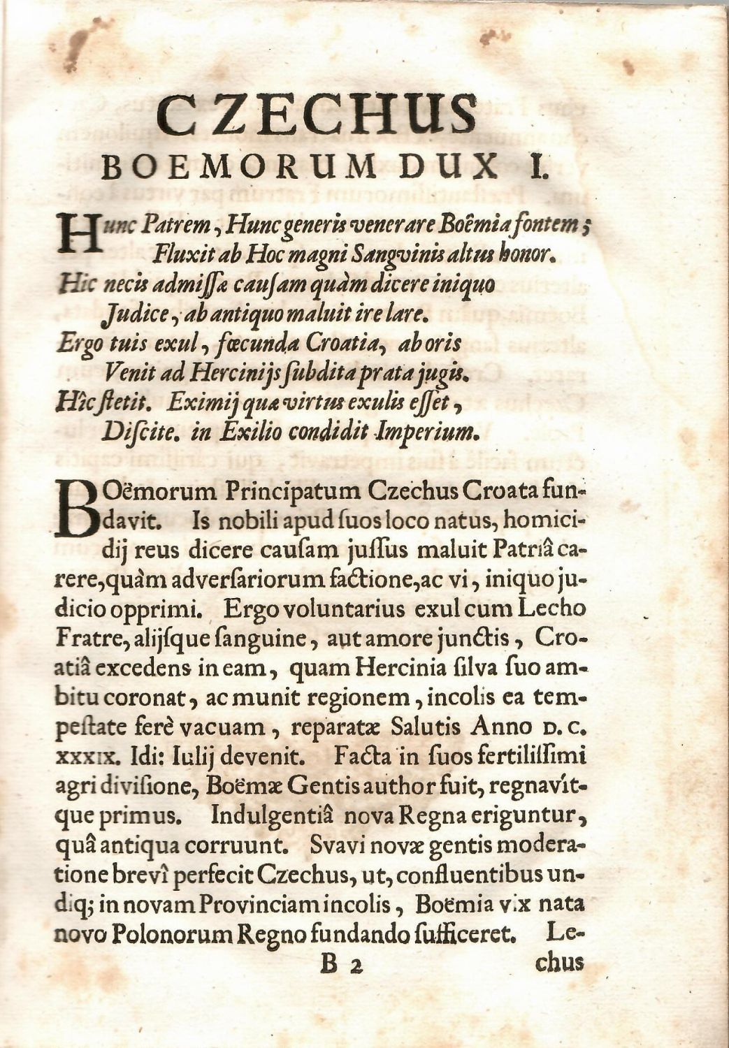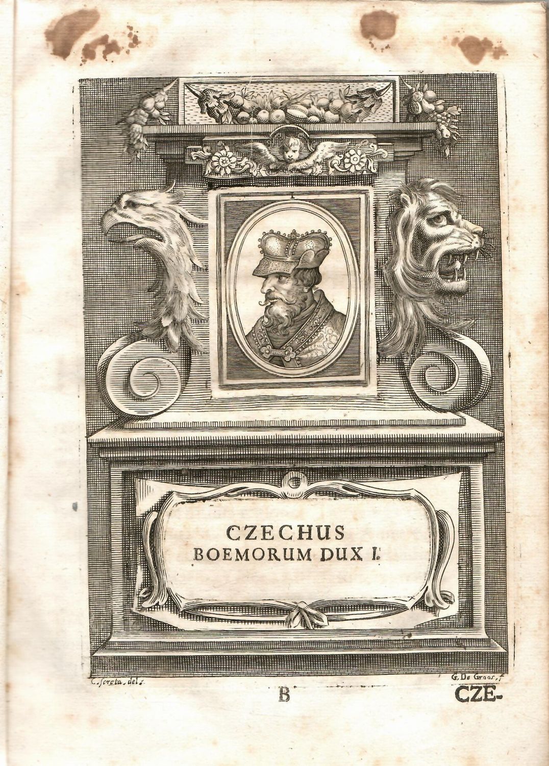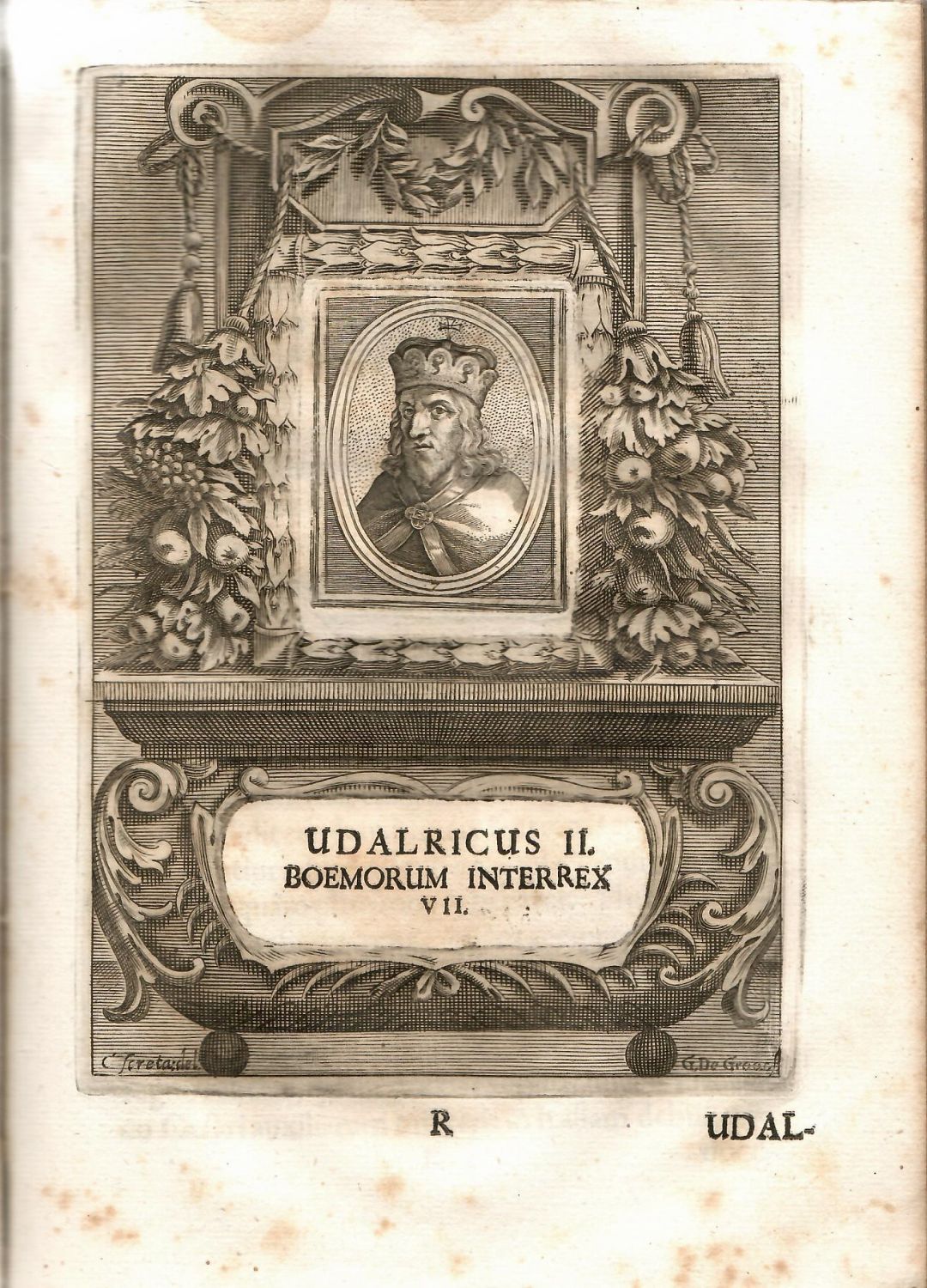 Zíbrt II, 2959 (uvádí vydání 1673 s 24 mědirytinami); Tříska str. 49, Pumprla 1/4 1814, Voit 2/863<br>Latinský text antikvou, titulní list zčásti tištěný versálkami přes dvě strany, nadpisy s římskými čísly, signatury, stránkové kustody, plné verzály ve volném prostoru ve výši dvou řádků, ve front. alegorická mědirytina, kterou podle Karla Škréty vyryl Jan Adrian Gerhard de Groos, v textu 61 celostránkových mědirytin stejných autorů zobrazujících české panovníky, portréty jsou komponovány do oválných medailonů, které jsou vsazeny do obdélníkových šrafovaných rámů, které jsou obklopeny bohatým ornamentálním, květinovým či heraldickým dekorem, pod kompozicí je podstavec uvnitř kterého je zakulacená deska na pozadí ornamentální výzdoby se jménem a titulem panovníka. Ke každé mědirytině je krátký doplňující text s bibliografickými údaji o jednotlivých panovnících. Na konci každého textu dřevořezová viněta.<br>Kartonové desky potažené pergamenem, při horním okraji hřbetu pap. štítek s červeně tlačeným názvem, barvené ořízky. Uprostřed hřbetu utržený pergamen. pokryv cca o rozměru 30 x 20 mm. Chybí titulní list, na přední předsádce hnědým perem opsaný tit. list, pravděpodobně ve druhé polovině 18. století. Na prvních 4 listech při horních okrajích postupně se zmenšující dvě hnědé skvrny (bez zásahu do textu), papír místy mírně zahnědlý. <br>Julius Soliman (1595-1639) působil jako profesor rétoriky a filosofie na klementinské akademii. První vydání nabíze.né knihy vyšlo roku 1629. Toto druhé vydání s nezměněným textem bylo pořízeno jako Althanova universitní teze s použitím portrétů z prvního vydání, nově však zasazených do barokních kompozic kreslených Karlem Škrétou a rytých Gerhardem de Groosem. Portréty panovníků vycházejí z podob v Kuthenově Kronice z roku 1539.