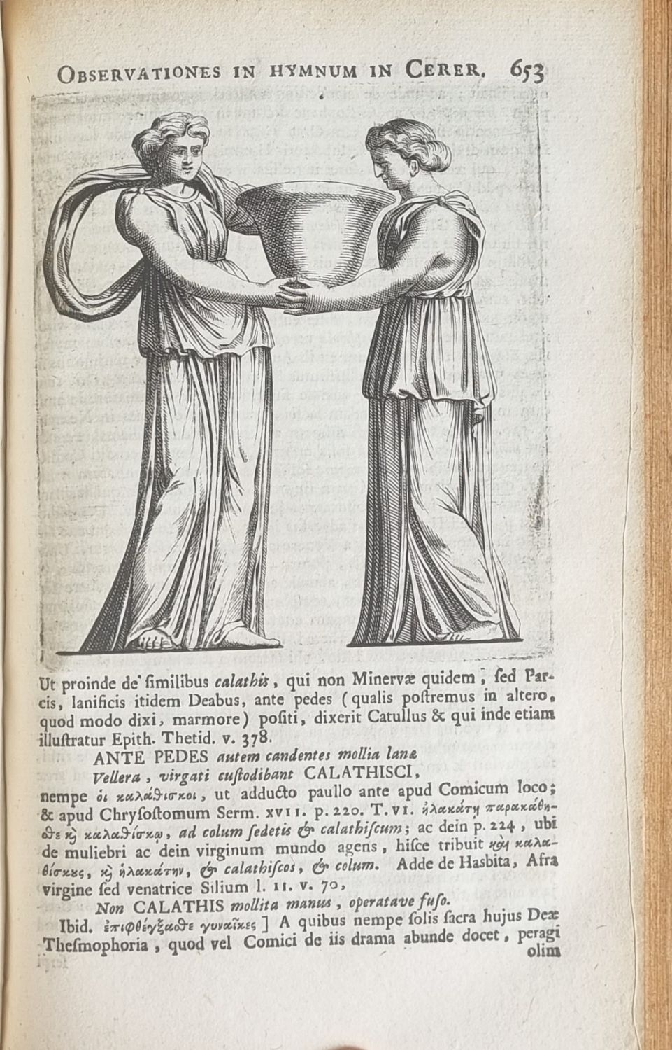 Antikva, řecká slova alfabetou, na tit. listu mědirytinová viněta, v textu cca 46 mědirytin převážně s vyobrazením řeckých mincí a medailí, na čtyřech vyobrazení Minervy, Proserpiny, sochy Diany. Živá záhlaví, dřevořezové viněty, rejstřík tištěný ve dvou sloupcích. <br>Dobová pergamenová vazba, při horním okraji hřbetu černým perem napsaný název, na přední předsádce, na tit. listu a dvou následujících listech při spodním vnějším kraji drobné stopy od červotoče, papír místy lehce zahnědlý. <br>V knize Spanheim rozebírá postupně šest hymnů Kalimachových. Ezechiel Spanheim (7.12. 1629 Ženeva - 7.11. 1710 Londýn), německý právník, filolog, diplomat a teolog švýcarského původu. Vystudoval filosofii a teologii na universitě v Leidenu, roku 1651 přijal profesoru na universitě v Ženevě. Od roku 1656 se věnoval výhradně politice, působil na dvoře falckého kurfiřta v Heidelbergu a zastupoval jeho zájmy v různých diplomatických jednáních a misích (ve Vatikánu, v Paříži, v Londýně ...). Roku 1679 byl zvolen členem Královské společnosti. Od roku 1780 působil ve službách braniborských kurfiřtů. Po vydání nantského ediktu pomohl mnoha hugenotům k emigraci z Francie do Pruska. Roku 1702 byl povýšen do šlechtického stavu. Z finančních důvodů prodal svoji rozsáhlou a vědecky velmi cennou knihovnu pruskému králi Friedrichu I. Sbíral také mince a napsal knihu o antických mincích a medailích, přeložil z řečtiny do latiny Kalimachovy Epigramy a hymny.