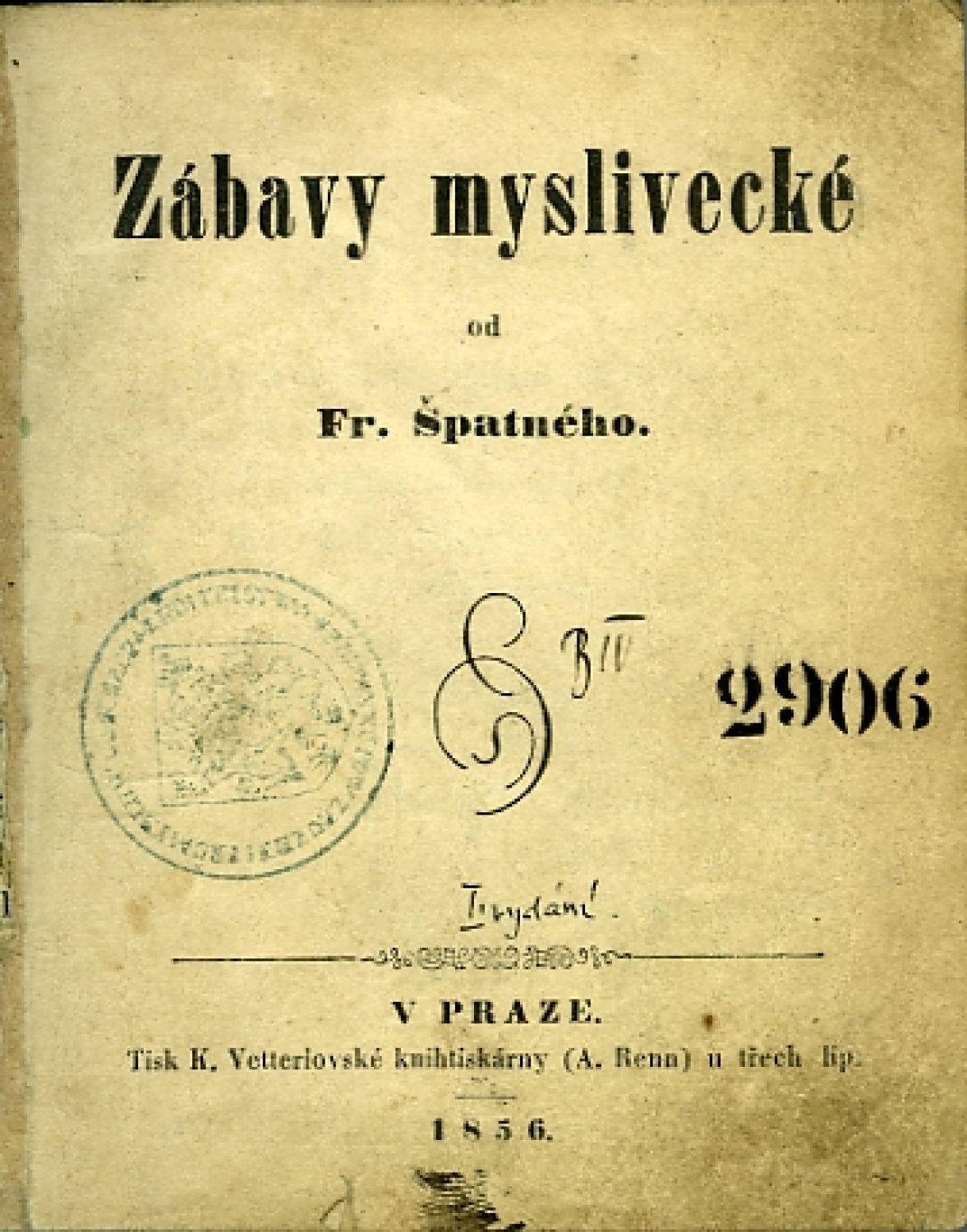 Tučně tištěné nadpisy jednotlivých kapitol. Ve 2. svazku na str. 47 xylografický obrázek medvěda, na str. 60-61 téhož svazku notový tisk (píseň Bivoj), na str. 61 3. svazku notový tisk (píseň Jelen), na str. 60-61 4. svazku notový tisk (písně Myslivec a Postřelená kačena), na str. 59-60 5. svazku notový tisk (píseň Myslivecká). - Kartonová vazba potažená škrobovým papírem, plátěný hřbet a nárožnice; desky silně odřené a mírně uvolněné, ve hřbetu tlačený a zlacený název, při jeho dolním okraji přelepený knih. pap. štítek, papír zahnědlý, na rubu tit. listu 1. dílu staré razítko "Národní technické museum knihovna" s evidenčními čísly, na první straně 3. svazku razítko "Verain zur Erichterung des Gewerbgeistes in Böhmenů, u 2. svazku při spodním okraji str. 3-4 utržen kousek papíru, několik stran při spodním okraji natržených.U všech svazků chybí původní zelené pap. obálky s údaji o díle.<br>Kompletní dílo v pěti svazcích, které vycházelo v letech 1856 (K. Vetterlová, A. Renn), 1857 (2. sv. K. Vetterlová, A. Renn), 1858 (3. sv. A. Renn), 1859 (4. sv., K. Bellmann) a 1861 (5. sv., K. Bellmann). V kompletu se nachází dle Souborného katalogu knih pouze v Knihovně NM v Praze.<br>František Špatný (8.3. 1814 Bor u Protivína - 9.6. 1883 Praha), lexikograf, autor slovníků a mnoha odborných textů z oblasti lesnictví, zemědělství a řemesel. V letech 1835-1849 působil jako úředník na schwarzenberském panství. Revoluční rok 1848 strávil na Smíchově, usiloval o povýšení obce na město, v červnu byl zatčen a několik dnů strávil ve vazbě, pro nedostatek důkazů byl propuštěn. Později byl ve státních službách, ale nadřízení k němu chovali nedůvěru pro jeho postoje v roce 1848. Rád naslouchal vyprávění prostých řemeslníků, čeledínů, myslivců, nechal si od nich také popisovat jejich pracovní postupy, nářadí a další pomůcky a vše si zapisoval. Jeho snahou bylo uchovat původní české názvosloví pro všechna řemesla.<br> V nabízeném díle je obsažena řada článků o myslivosti, několik národních a také novějších mysliveckých písní, mysliveckých průpovídek, pověstí, výkladu zákonů o myslivosti, vysvětlení myslivecké mluvy. Autor čerpal z různých pramenů, jak osobních, tak z literatury, různých vyprávění a vždy pramen uvádí.