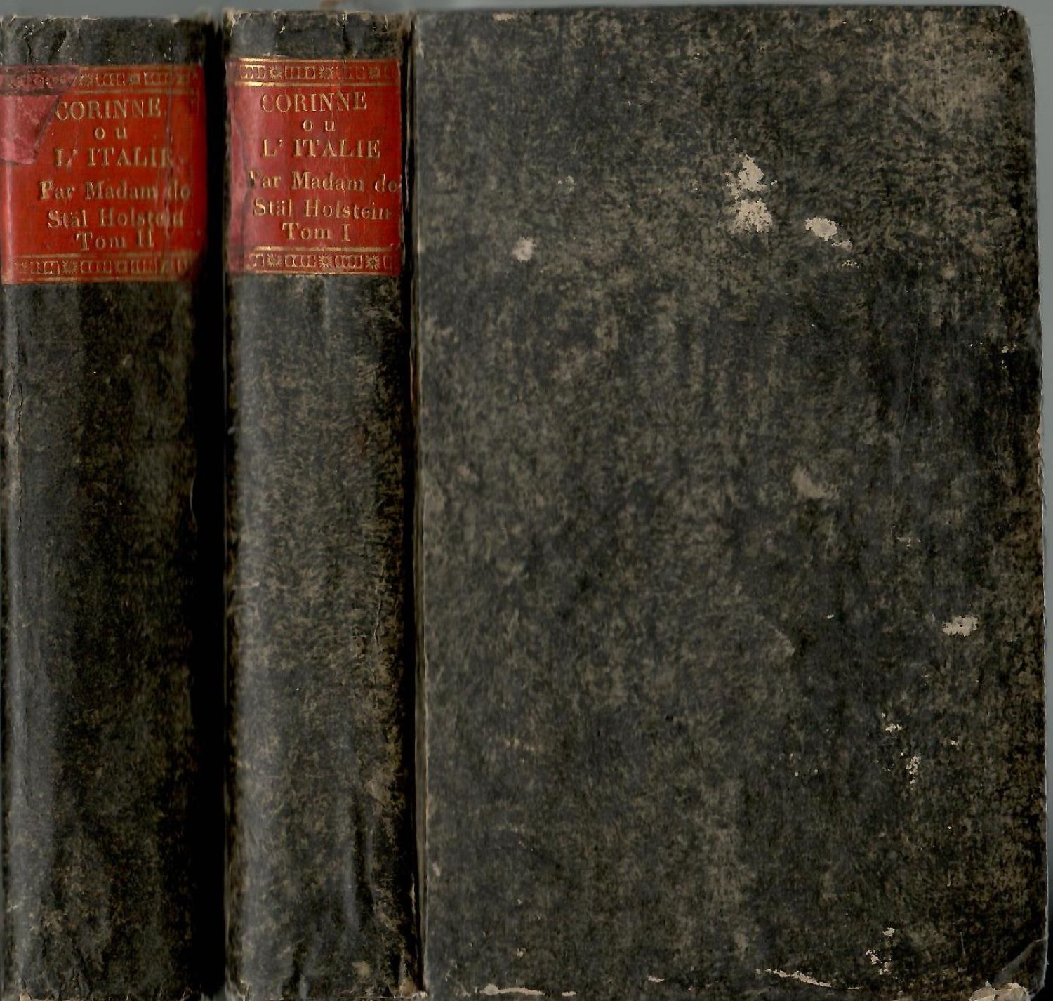 Jednotné vazby, červené hřbetní štítky se zlac. věcným názvem. Vazby odřené, průběžně hnědé skvrnky; u 1. sv. chybí patitul, tit. list je zpola odtržený, list s obsahem vevázán vzadu, kdežto ve 2. sv. vpředu. - Vydáno v roce obou prvních vydání, bez uvedení nakladatele. Původní vydání pochází z února a první oficiální z května r. 1807, obě tiskla pařížská Imprimerie des Annales, kterýžto údaj se zde nachází pouze na rubu patitulu 2. sv. Později téhož roku vydal knihu ještě H. Nicolle v Paříži (ve 3 sv.) a M. Peltier v Londýně. - Tento román zrozený z cesty do Itálie a z milostného přátelství Mme de Staël (1766-1817) s mladým diplomatem Pierrem de Souza Holstein, se stal knihou ideální lásky pro celou tehdejší romantickou generaci.