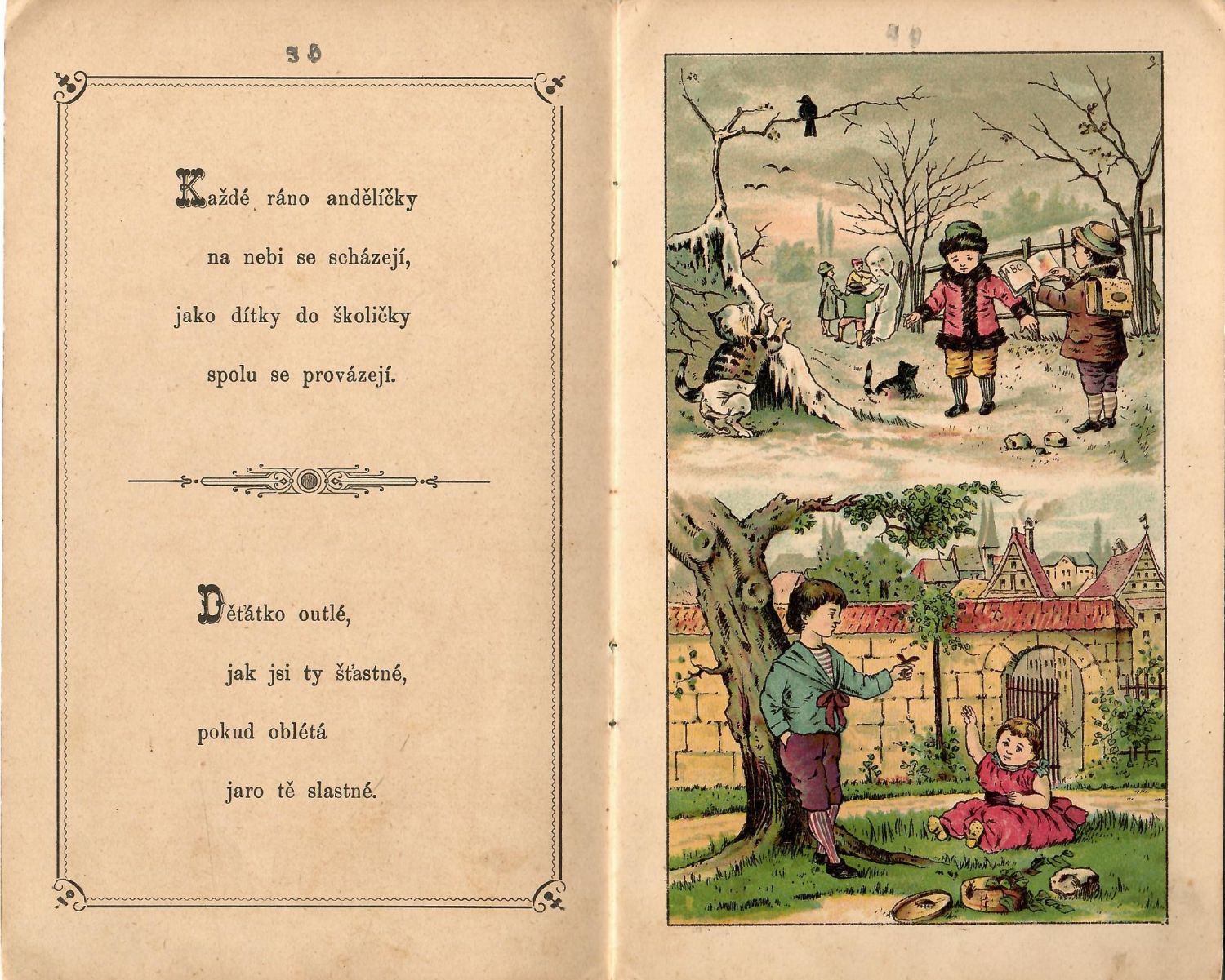Tištěno antikvou, , tučně tištěné iniciály. Celkem 12 říkadel tištěných ve 4 řádcích, dvě na straně od sebe oddělené ozdobnou tyčí a strana zasazená v ozdobném rámečku, 6 celostr. barvotiskových ilustrací. Původní pap. obálka s barvotiskovou ilustrací na přední straně.