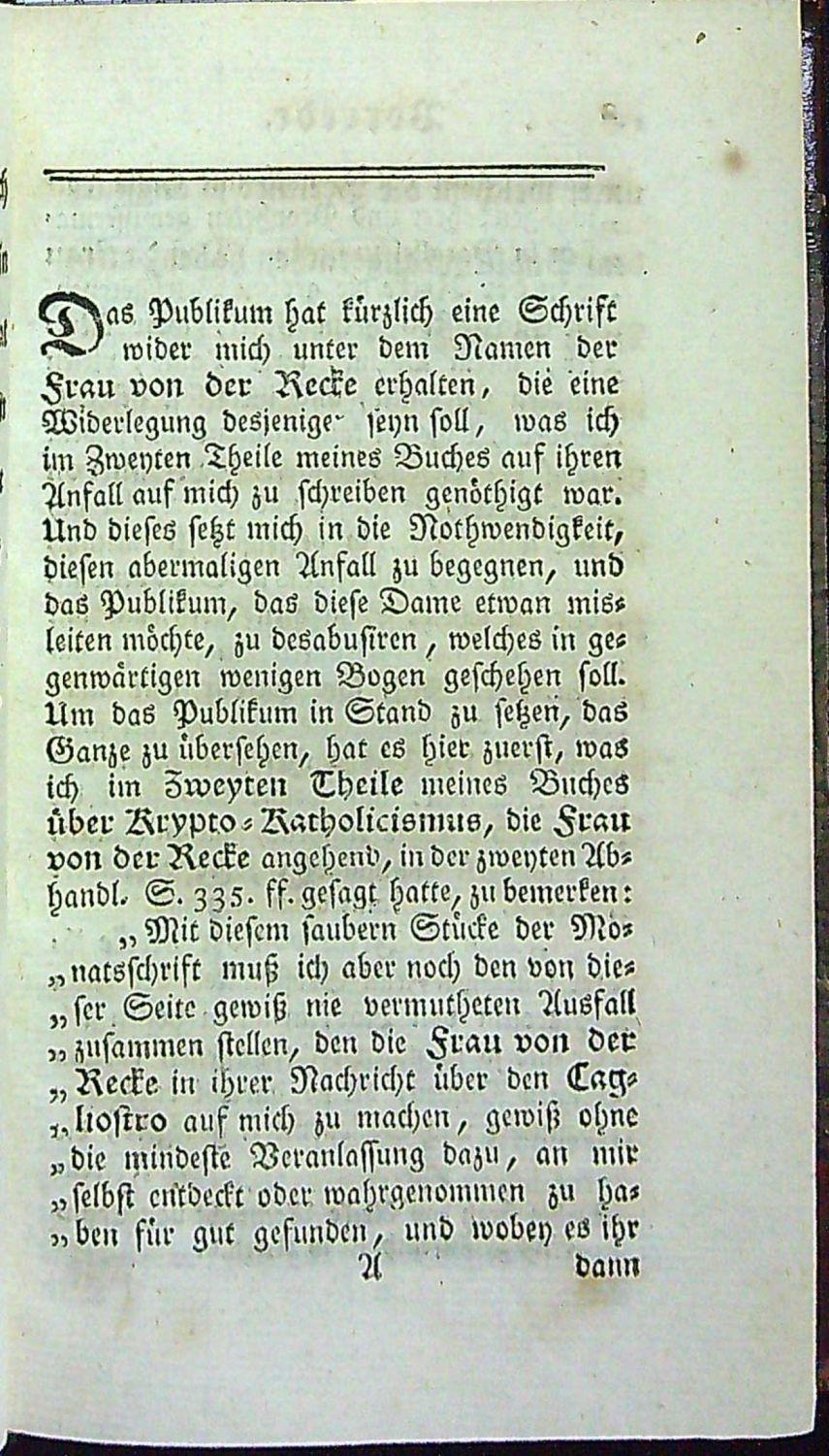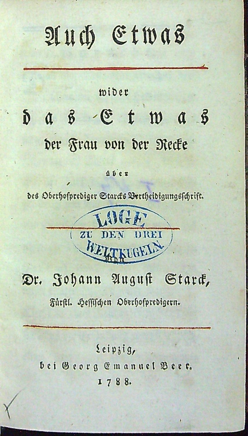 Wolfstieg 23246.<br>Tištěno švabachem, francouzská a latinská slova antikvou, tištěné poznámky pod čarou. Na poslední nepaginované straně tisková oprava. <br>+ přívazek: "Der Berlinismus oder Freundschaftsgespräch über Doktor Starck (správně Starck) und seine Gegner". Templin und Ephesus [= Leipzig, Crusius], 1788, 132 stran. Tištěno švabachem, latinská slova antikvou, arabská paginace stran uprostřed horního okraje v hranatých závorkách, na tit. listu viněta, v záhlaví předmluvy a začátku vlastního textu dvě ozdobné lišty. (Wolfstieg 23250).<br>Dobová vazba s kartonovými deskami potaženými mramorovaným papírem, kožený hřbet a nárožnice, ve hřbetu 5 vazů, ve druhém poli dobový červený kožený štítek s tlačeným a zlaceným názvem prvního díla, ve třetím hnědý s tlačeným a zlaceným názvem díla druhého, v ostatních polích tlačené a zlacené ornamenty, červeně barvené ořízky. Kůže hřbetu místy odřená, při horním i spodním okraji lehce natržená, ve spodním poli torso pap. knih. štítku. Na tit. listu prvního díla staré razítko nejstarší německé zednářské lóže "Loge zu den drei Weltkugeln", která měla hlavní sídlo v Berlíně. <br>Johann August Starck (28.10. 1741 Schwerin - 3.3. 1816 Darmstadt) studoval teologii a orientální jazyky na universitě v Göttingenu, roku 1761 byl zasvěcen francouzskou zednářskou lóží v Göttingenu. Roku 1763 odešel vyučovat orientální jazyky na universitu v Petrohradu, po mnoha peripetiích dorazil roku 1769 do Königsbergu, kde se stal mimořádným profesorem orientálních jazyků na universitě. Pro řadu neshod s místní pruskou konsistoří roku 1777 rezignoval na své funkce na universitě a odešel vyučovat filosofii na gymnasium v Mitau v Kurlandsku, které bylo v tehdejší době centrem zednářského hnutí. V roce 1780 nastal obrat v jeho myšlení a Starck se v důsledku toho rozešel se zednářským hnutím a odešel roku 1781 do Darmstadtu, kde se stal dvorním kaplanem a generálním dozorcem škol.
