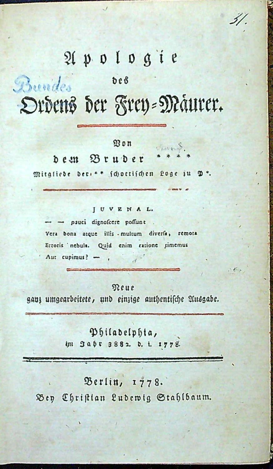 Apologie des Ordens der Frey=Mäurer. Von dem Bruder **** Mitgliede der** schottischen Loge zu P*. Neue ganz umgearbeitete, und einzige authentische Ausgabe. Philadelphia, im Jahr 3882 d.i. 1778.