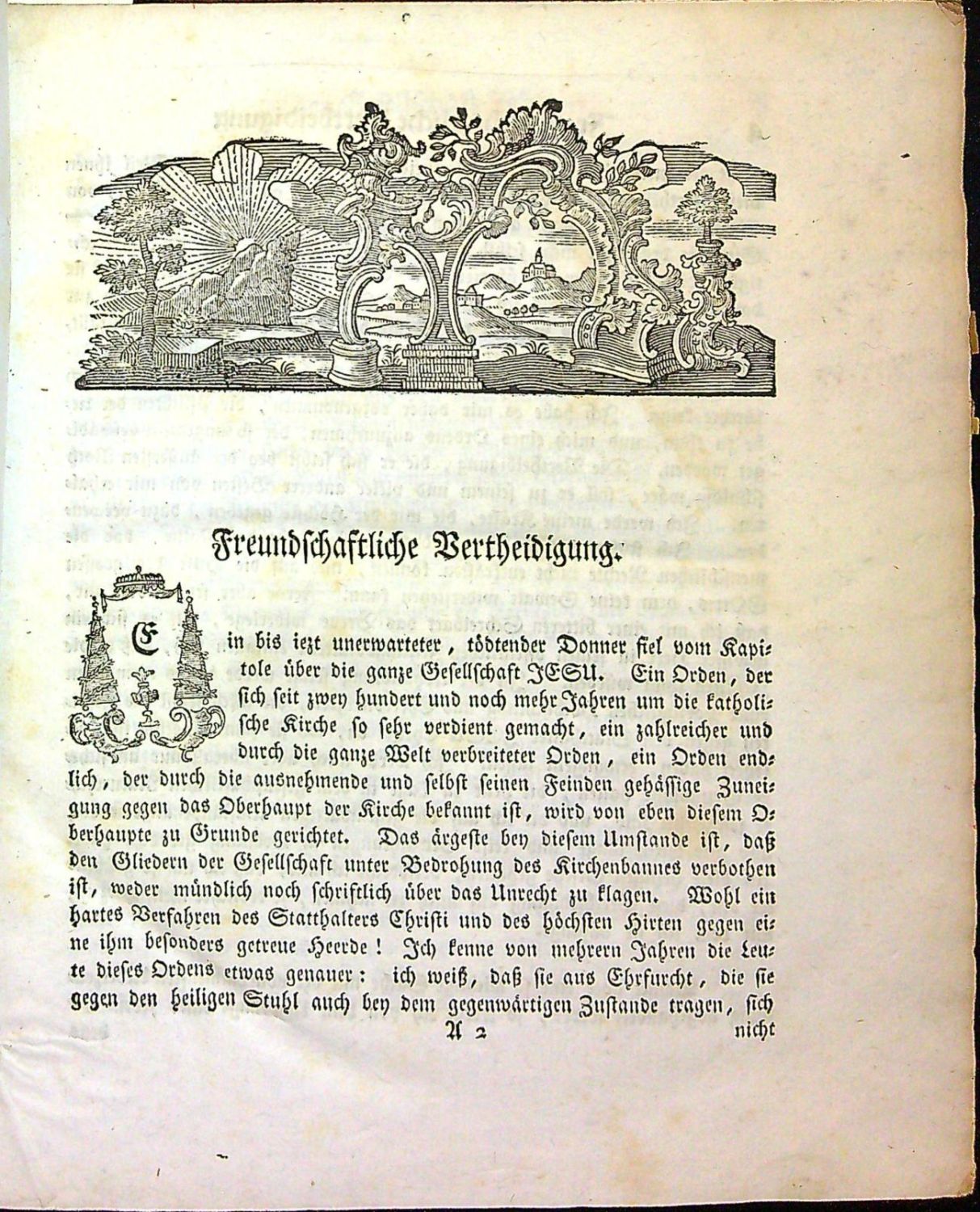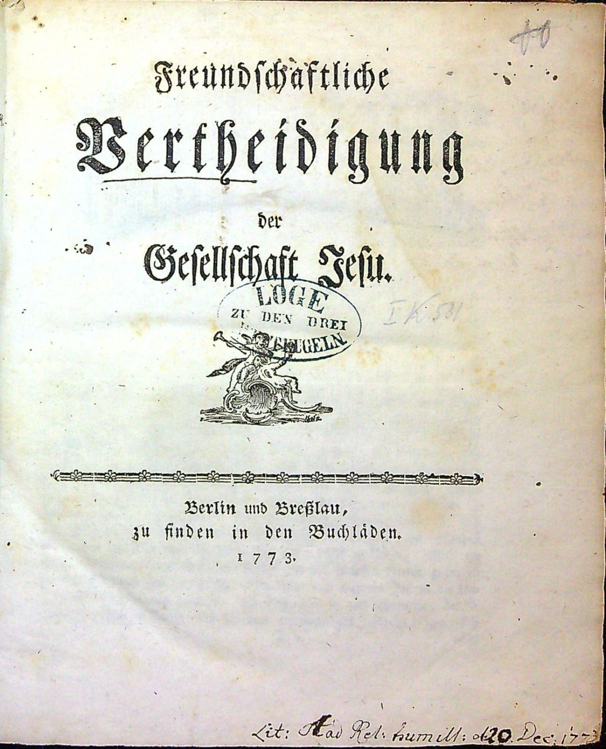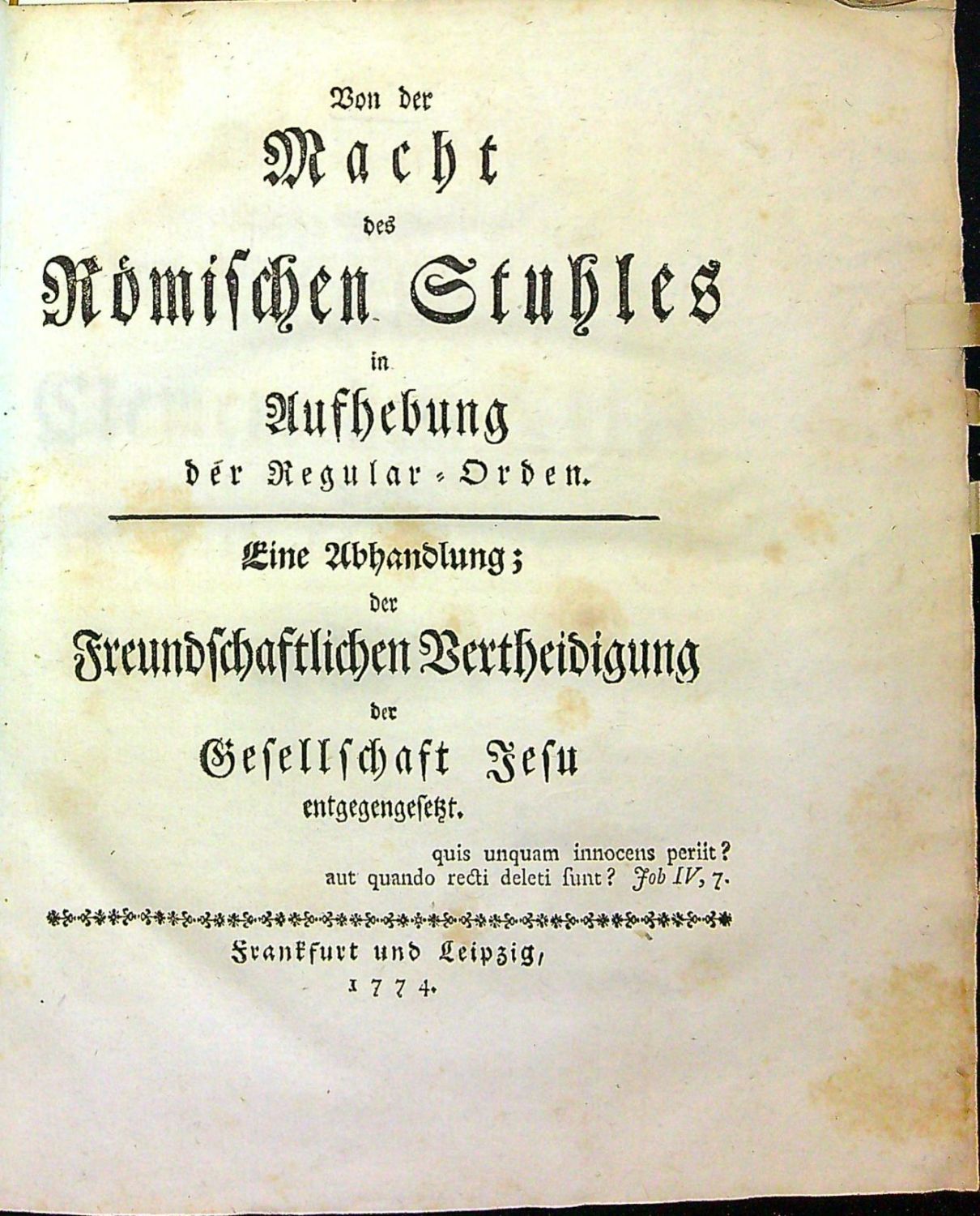 Tištěno švabachem, latinský text antikvou, na tit. listu drobná vinětka, vstupní pásový vlys s ilustrací, vstupní tučně tištěná versálka zakomponovaná v rokokovém rámci.<br>+ 1. přívazek: [Heinrich Braun] "Von der Macht des Römischen Stuhles in Aufhebung der Regular-Orden. Eine Abhandlung; der Freundschaftlichen Vertheidigung der Gesellschaft Jesu entgegengesetzt". Frankfurt und Leipzig, bez uvedení vydavatele, 1774, 24 stran, uprostřed horního okraje stran mizící ozdobná tyč, vstupní pásový vlys florálního charakteru.<br>+ 2. přívazek: [Christoph Heinrich Korn] "Gespräch im Reiche der Todten, zwischen dem Pater Angelo, einem Jesuiten, und dem Ritter von Moncada, einem ehemaligen Tempelherrn; worinn die Geschichte dieser beeden berühmten Orden, und die Aufhebung derselben, nebst andern merkwürdigen Dingen kurz und unpartheyisch erzehlet wird". [Nürnberg], 1774, 128-111-[I]-84-[IV - poslední čistá] str. + 1 mědiryt. příloha. Tištěno švabachem, latinský text antikvou, šest dílů, pět titulních listů (díl 5. a 6. se společným tit. listem), průběžná paginace po dvou dílech, ozdobné tyče, viněty, pásový vlys v záhlaví začátku 5. dílu, strana 7 5. dílu nepotištěná, za 6. dílem příloha s celostr. mědirytinou. (Holzmann-Bohatta II,7253; Wolfstieg 5133).<br>+ 4. přívazek: "Grabschrift auf die sterbende Gesellschaft Jesu, mit Anmerkungen in einem Sendschreiben erläutert". Frankfurt und Leipzig, bez uvedení vydavatele, 1774. 18 stran, tištěno švabachem, v úvodu na dvou nečísl. listech náhrobní nápis pro umírající Společnost Ježíše, na dalších čísl. listech vysvětlující poznámky k nápisu, v záhlaví pásový vlys, uprostřed horního okraje stran drobné tiskařské ozdůbky.<br>+ 5. přívazek: "Der Pfaff/ und Proiectant Ein Lehrgedicht Des Herrn °°° Auf das Jahr 1774". Petersburg (pravděpodobně fingovaný údaj, Vídeň ?), Adam Menschenfreund (pravděpodobně fingovaný údaj), [1774]. 8 nečíslovaných listů, tištěno švabachem, na tit. listu viněta, koncová viněta, v úvodu pásový vlys s drobným ornamentem v prolamovaném rámečku, iniciálky propletené úponky. (KVK ani Worldcat katalog neevidují).<br> Kartonové desky potažené škrobovým papírem, kožený hřbet a nárožnice, barvené ořízky. Ve hřbetu 5 vazů, ve druhém poli pap. štítek s psaným názvem, při spodním okraji hřbetu pap. knih. štítek s číslem. Vazba ohmataná a místy odřená, při horním i spodním okraji hřbetu kůže natržená. Na předním přídeští nalepeno mědiryt. ex libris Gustava Partheye, na rubu přední předsádky rukou psaný seznam titulů ve svazku, na tit. listu prvního díla staré razítko berlínské zednářské lóže "Zu den drei Weltkugeln".<br>Gustav Friedrich Konstantin Parthey (27.10. 1798 Berlín - 2.4. 1872 Řím), významný německý filolog a historik umění, od roku 1857 člen Pruské akademie věd. Mimo jiné autor zásadního soupisu grafických prací Václava Hollara, který vyšel poprvé tiskem roku 1853. Jeho matka byla nejstarší dcerou spisovatele, kritika a knihkupce Friedricha Nicolaie, který založil "Nicolaische Buchhandlung" v Berlíně, a které Parthey později převzal.<br>