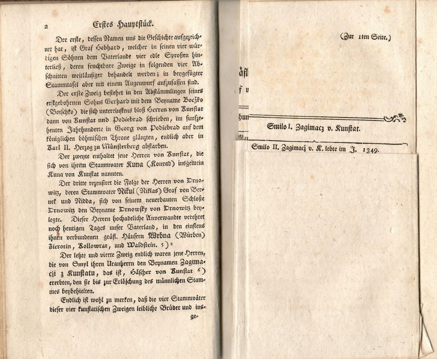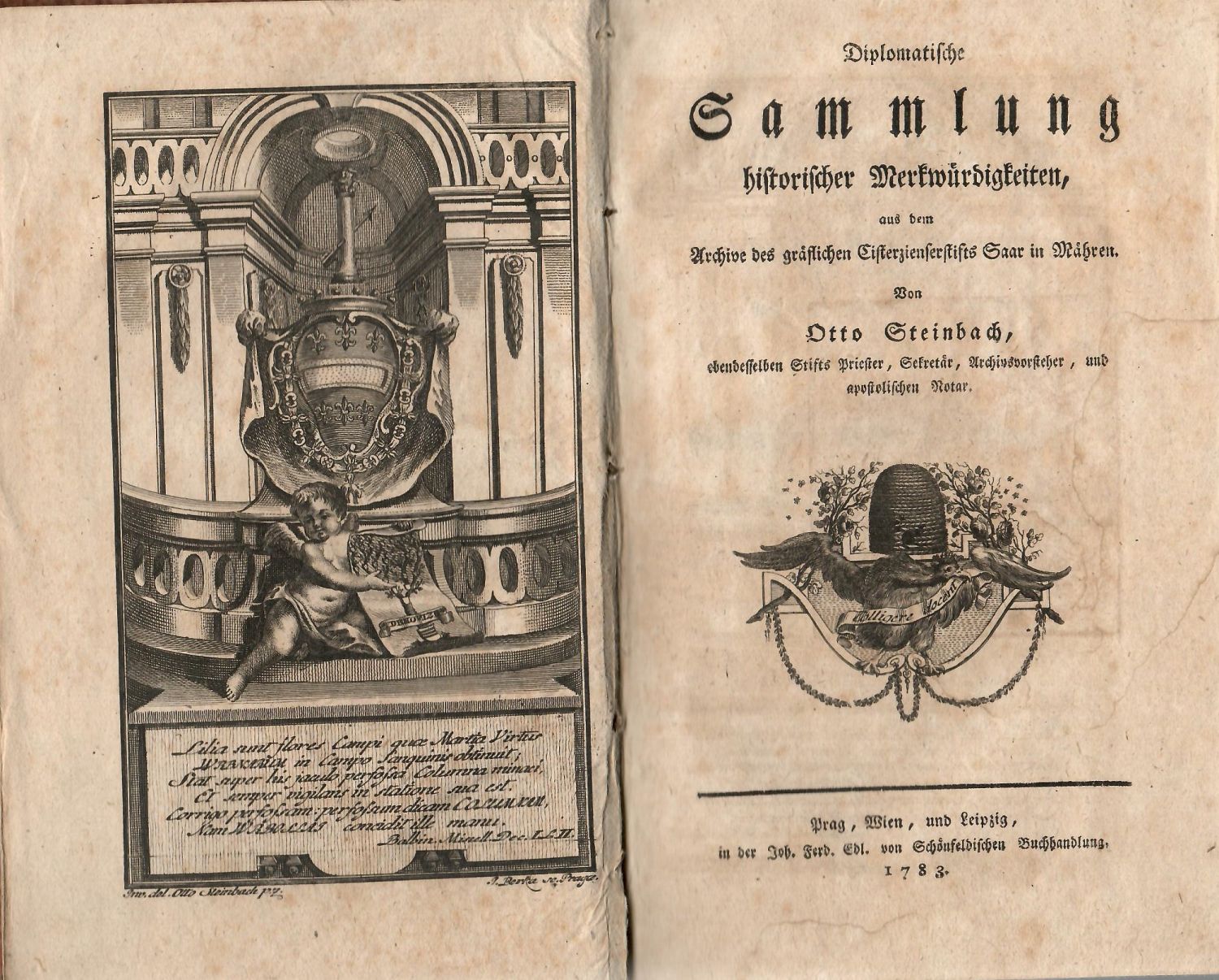 Knihopis 15.967<br>Německý a český text gotikou, latinský antikvou, signatury, stránkové kustody, arabské číslování stran při horním vnějším okraji, živá záhlaví, ozdobné linky, iniciálky ve výši dvou řádků, dřevořezové viněty. Ve front. mědirytina od J. Berky s citátem z Balbínových Miscellaneí, na tit. listě 1. i 2. dílu mědirytinová viněta, na 1. stránce textu 1. dílu mědirytina s vyobrazením Jiřího z Poděbrad, na str. 71 mědirytina s vyobrazením žďárského kláštera, na str. 327 mědirytina s vyobrazením Jana Greifenfelse z Pilsenburgu (od roku 1634 opata zbraslavského kláštera, který roku 1650 zemřel ve žďárském klášteře), za str. 2 prvého dílu rozkládací genealogická tabule s rodokmenem pánů z Kunštátu a Poděbrad, ve druhém dílu 5 celostr. mědirytinových příloh s vyobrazením různých pečetí.<br>Dobová kartonová vazba potažená mramorovaným papírem, při horním okraji hřbetu dobový červený kožený štítek s tlačeným a zlaceným názvem. Vazba ohmataná a místy odřená, naražené rohy, při spodním oékraji hřbetu nalepen starý pap. knih. štítek, papír při horním i spodním okraji hřbetu chybí proužek pap. pokryvu, podél hřbetu přední strany vazby papír místy potrhaný, místy chybí. Na předním přídeští ex libris děčínské Thun-Hohensteinské knihovny, která byla majitely rozprodána v několika aukcích ve 30. letech 20. století.<br>Otto Steinbach z Kranichštejna (13. 11. 1751 v Rožmitále - 19. 2. 1791 ve Vídni) poslední opat cisterciáckého kláštera ve Žďáru nad Sázavou, významný historik a archivář osvícenského a liberálního přesvědčení. Nabízená práce zůstala nedokončena a zůstává stále důležitou pramennou prací k dějinám žďárského kláštera.