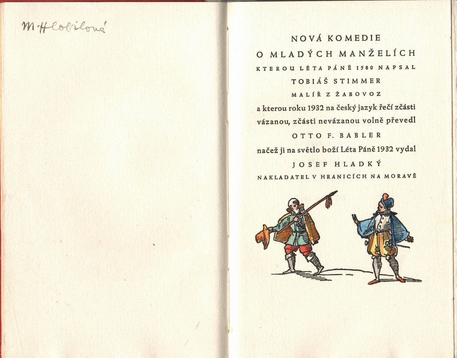 Nová komedie o mladých manželích, kterou napsal léta Páně 1580 Tobiáš Stimmer a kterou roku 1932 na český jazyk řečí zčásti vázanou, zčásti nevázanou volně převedl Otto F. Babler. Tištěno na ručním papíře v úpravě Rudolfa Hály. Č.ex. 155/200. Ručně kolorovala Marie Hlobilová-Mrkvičková.<br>Na přední desce tlačená a zlacená postavička blázna (šaška), ve hřbetu tlačený a zlacený věcný název knihy. Velmi dobrý stav.