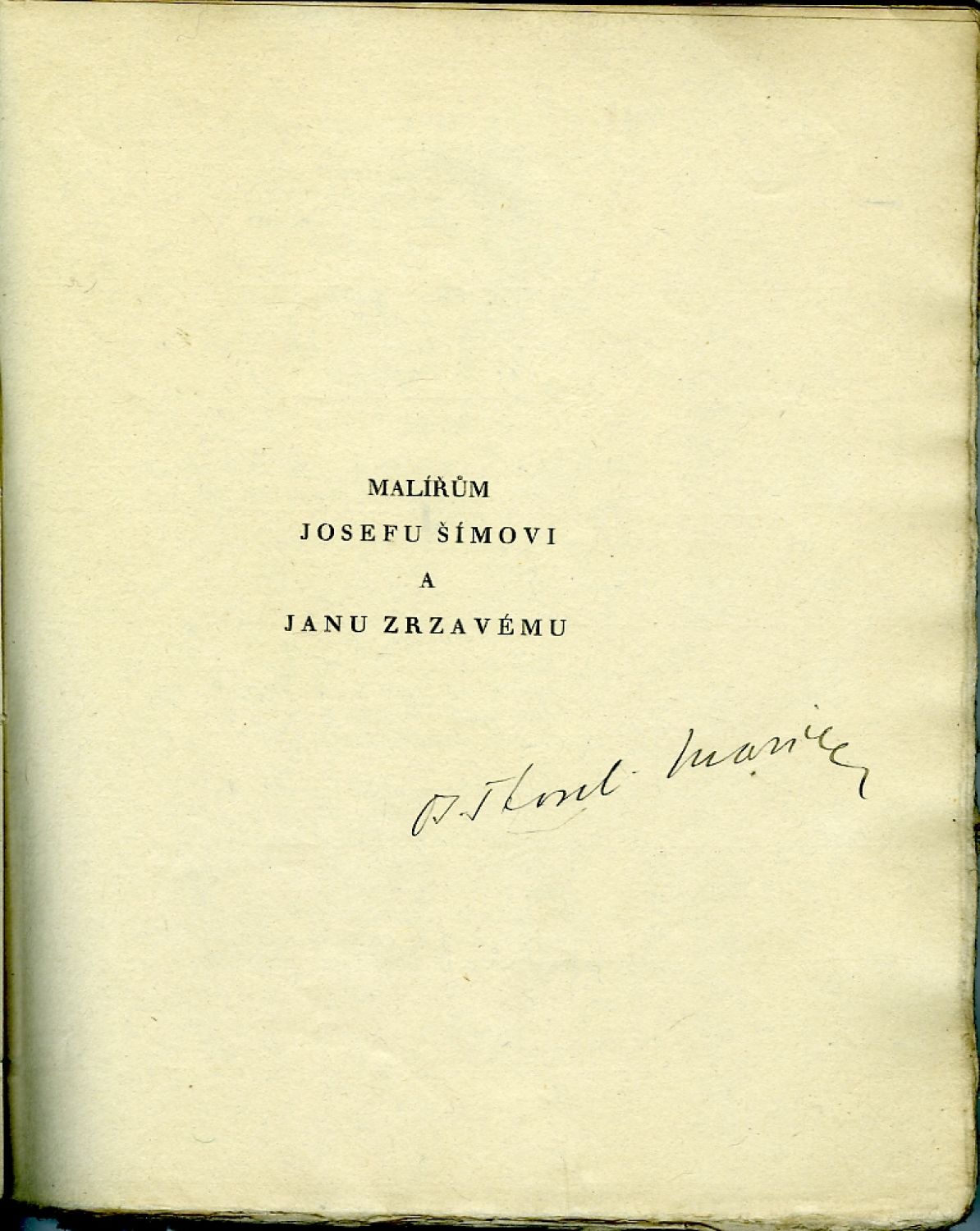 V úpravě V. H. Brunnera vytiskl Fr. Obzina ve Vyškově na papíře Ullersdorf v 600 čísl. výt. (prvních 30 kolorováno a podepsáno). - Ex. č. 401. Přední listy s lehkou vertikální stopou po přeložení, palist ušpiněný, obálka na dolním okraji hřbetu natržená, spodní okraje obálky pomačkané. Na listu s tištěnou dedikací podpis autora.