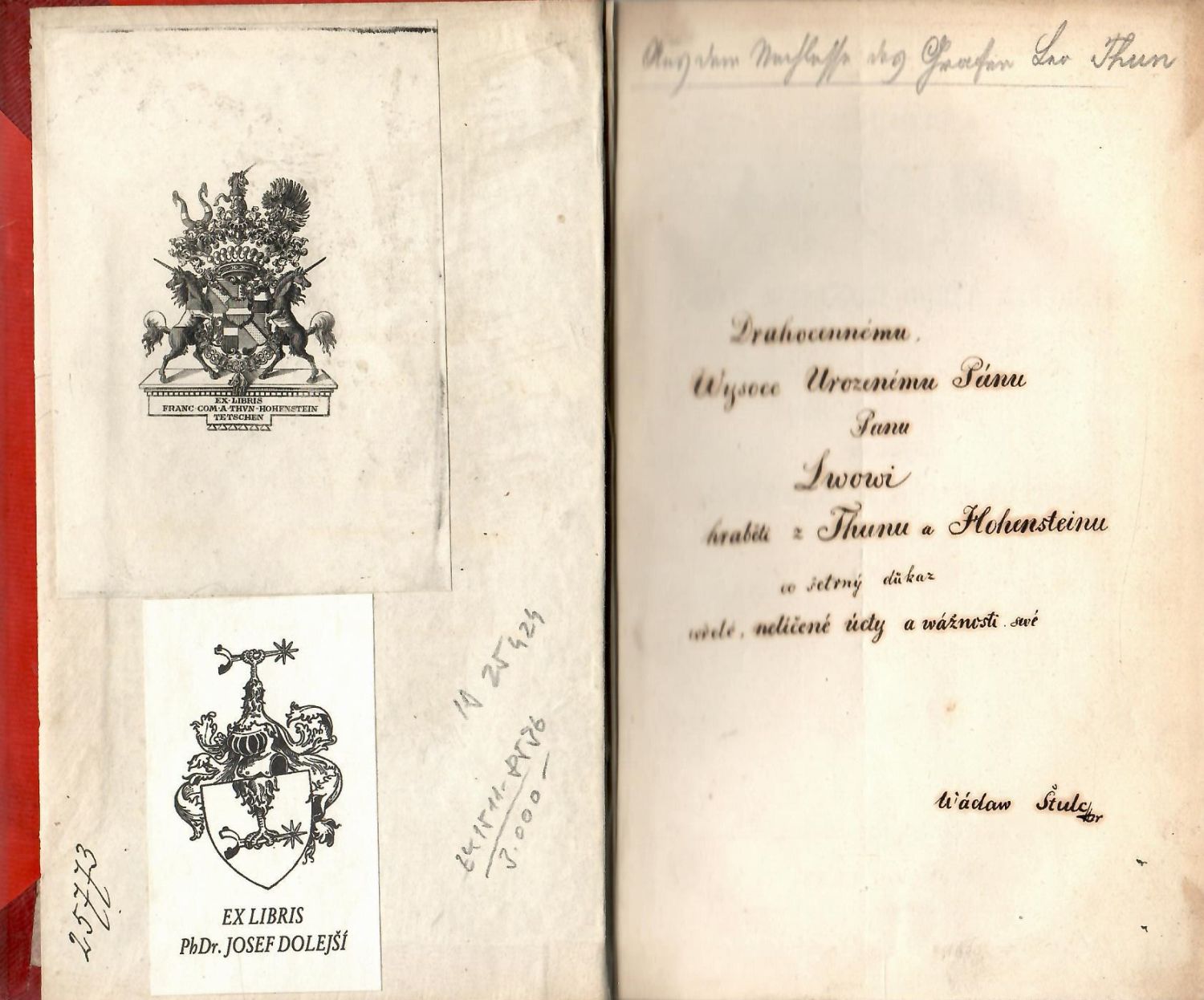 Český text tištěný antikvou, německý švabachem, versálkami tučně tištěné nadpisy jednotlivých kapitol, arabská paginace stran uprostřed horního okraje stran nad mizící linkou. <br>Dobová kožená vazba s deskami potaženými světle červeně barvenou kůží, ve hřbetu a v nárožnicích vínově červenou, ve hřbetu tlačený a zlacený název zasazený do ornamentální kompozice, zlacené ořízky, Na předním přídeští nalepené dvě proven. ex libris - Thun-Hohensteinské knihovny v Děčíně a PhDr. Josefa Dolejšího. Na přední předsádce rkp. dedikace autorova černým perem: "Drahocennému Wysoce Urozenému Pánu Panu Lwowi hraběti z Thunu a Hohensteinu w šetrný důkaz wřelé nelíčené úcty a wážnosti swé Wáclaw Štulc". - Při spodním okraji hřbetu nalepen starý pap. knih. štítek, při horním okraji hřbetu na zadní desce v délce cca 3 cm vazba naprasklá, při přední desce v délce cca 1,5 cm odřená.<br>Lev Thun-Hohenstein (7.4. 1811 Děčín - 17.12. 1888 Vídeň) český a rakouský politik, na pražské universitě studoval práva, velmi si vážil Bernarda Bolzana. 6. dubna roku 1848 byl jmenován guberniálním presidentem Českého království a 17. července téhož roku byl ze své funkce odvolán. Češtinu pokládal za svůj mateřský jazyk a byl ve styku s několika českými vlastenci. Později působil ve Vídni jako ministr školství a jeho zásluhou bylo zreformováno střední a universitní školství. Byl jedním ze zakladatelů Matice české.<br>Václav Štulc (20.12. 1814 Kladno - 9.8. 1887 Vyšehrad) spisovatel, překladatel a vlastenecký kněz, přední člen vyšehradské kapituly, která se velmi zasazoval o obnovení významu Vyšehradu. Od roku 1860 vyšehradským děkanem.