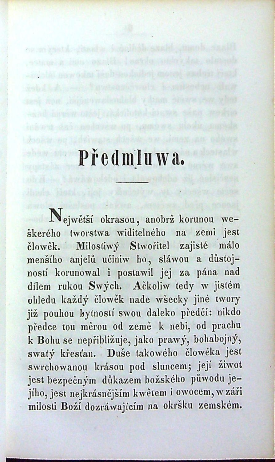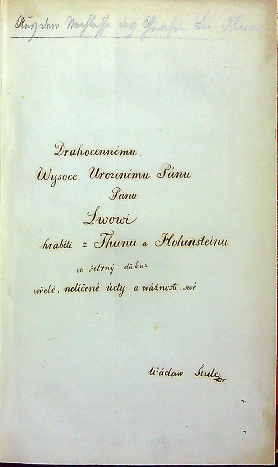 Český text tištěný antikvou, německý švabachem, versálkami tučně tištěné nadpisy jednotlivých kapitol, arabská paginace stran uprostřed horního okraje stran nad mizící linkou. <br>Dobová kožená vazba s deskami potaženými světle červeně barvenou kůží, ve hřbetu a v nárožnicích vínově červenou, ve hřbetu tlačený a zlacený název zasazený do ornamentální kompozice, zlacené ořízky, Na předním přídeští nalepené dvě proven. ex libris - Thun-Hohensteinské knihovny v Děčíně a PhDr. Josefa Dolejšího. Na přední předsádce rkp. dedikace autorova černým perem: "Drahocennému Wysoce Urozenému Pánu Panu Lwowi hraběti z Thunu a Hohensteinu w šetrný důkaz wřelé nelíčené úcty a wážnosti swé Wáclaw Štulc". - Při spodním okraji hřbetu nalepen starý pap. knih. štítek, při horním okraji hřbetu na zadní desce v délce cca 3 cm vazba naprasklá, při přední desce v délce cca 1,5 cm odřená.<br>Lev Thun-Hohenstein (7.4. 1811 Děčín - 17.12. 1888 Vídeň) český a rakouský politik, na pražské universitě studoval práva, velmi si vážil Bernarda Bolzana. 6. dubna roku 1848 byl jmenován guberniálním presidentem Českého království a 17. července téhož roku byl ze své funkce odvolán. Češtinu pokládal za svůj mateřský jazyk a byl ve styku s několika českými vlastenci. Později působil ve Vídni jako ministr školství a jeho zásluhou bylo zreformováno střední a universitní školství. Byl jedním ze zakladatelů Matice české.<br>Václav Štulc (20.12. 1814 Kladno - 9.8. 1887 Vyšehrad) spisovatel, překladatel a vlastenecký kněz, přední člen vyšehradské kapituly, která se velmi zasazoval o obnovení významu Vyšehradu. Od roku 1860 vyšehradským děkanem.