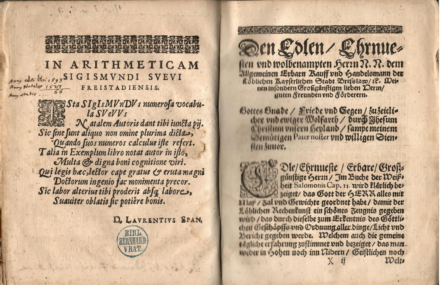VD 16 S4523<br>Červeno-černě tištěný titulní list s konturovou iniciálou na rostlinném pozadí a dřevořezovým pásovým vlysem v jednoduchém rámečku, tištěno gotikou, latinský text antikvou, signatury, stránkové kustody. Iniciály na rostlinném pozadí ve výši 3-6 řádků, pásové tyče z rostlinných ornamentů, dvě drobné viněty (na konci textu a za rejstříkem). Na rubu titulního listu oslavná báseň v latinském jazyku od českého humanisty Vavřince Špana ze Španova, za ní předmluva od S. Sueva datovaná 6.1. 1593, následuje latinská oslavná báseň z pera Nicolase Steinberga. <br>Pergamenová vazba z latinského rukopisu ze 14. století, zašpiněná a místy proděravělá červotočem, ve hřbetu mezi rukopisem psaným ve dvou sloupcích perem psaný název z 19. století, při spodním okraji hřbetu pap. knih. štítek z počátku 20. století. Na předním přídeští knih. záznam pastelkou z počátku 20. století, na tit. listu při horním okraji knih. čísla, při spodním okraji rukopisný prov. přípis z 18. století "Ex libris M. Johannis Friderici ?", na tit. listu uprostřed při vnějším okraji kulaté červené razítko z první poloviny 19. století "Bibl. Bernhard. Vrat.", na rubu modrá a mladší varianta razítka stejné knihovny, uprostřed vnitřního okraje tit. listu tlačený šlechtický erb z 18. století. Papír zahnědlý, za vlastním textem přivázáno 45 čistých listů dobového papíru na poznámky, na lící prvního listu rkp. poznámky a výpočty černým perem z 19. století. <br>Sigismund Schwabe, známý pod svým latinským jménem Sigismundus Suevus (1526 Freistad - 1596 Breslau), byl německý evangelický teolog, matematik, hudebník a básník. Působil jako kazatel v Lubani, od roku 1586 působil jako kněz ve Vratislavy. Nabízená kniha byla koncipována jako příprava na poslední soud spojením biblického učení a aritmetických znalostí a výpočtů.