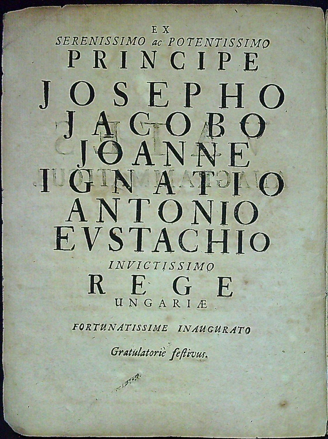 VATES ANAGRAMMATICUS. EX SERENISSIMO ac POTENTISSIMO PRINCIPE JOSEPHO JACOBO JOANNE IGNATIO ANTONIO EVSTACHIO INVICTISSIMO REGE UNGARIAE FORTUNATISSIME INAUGURATO Gratulatorie festivus.