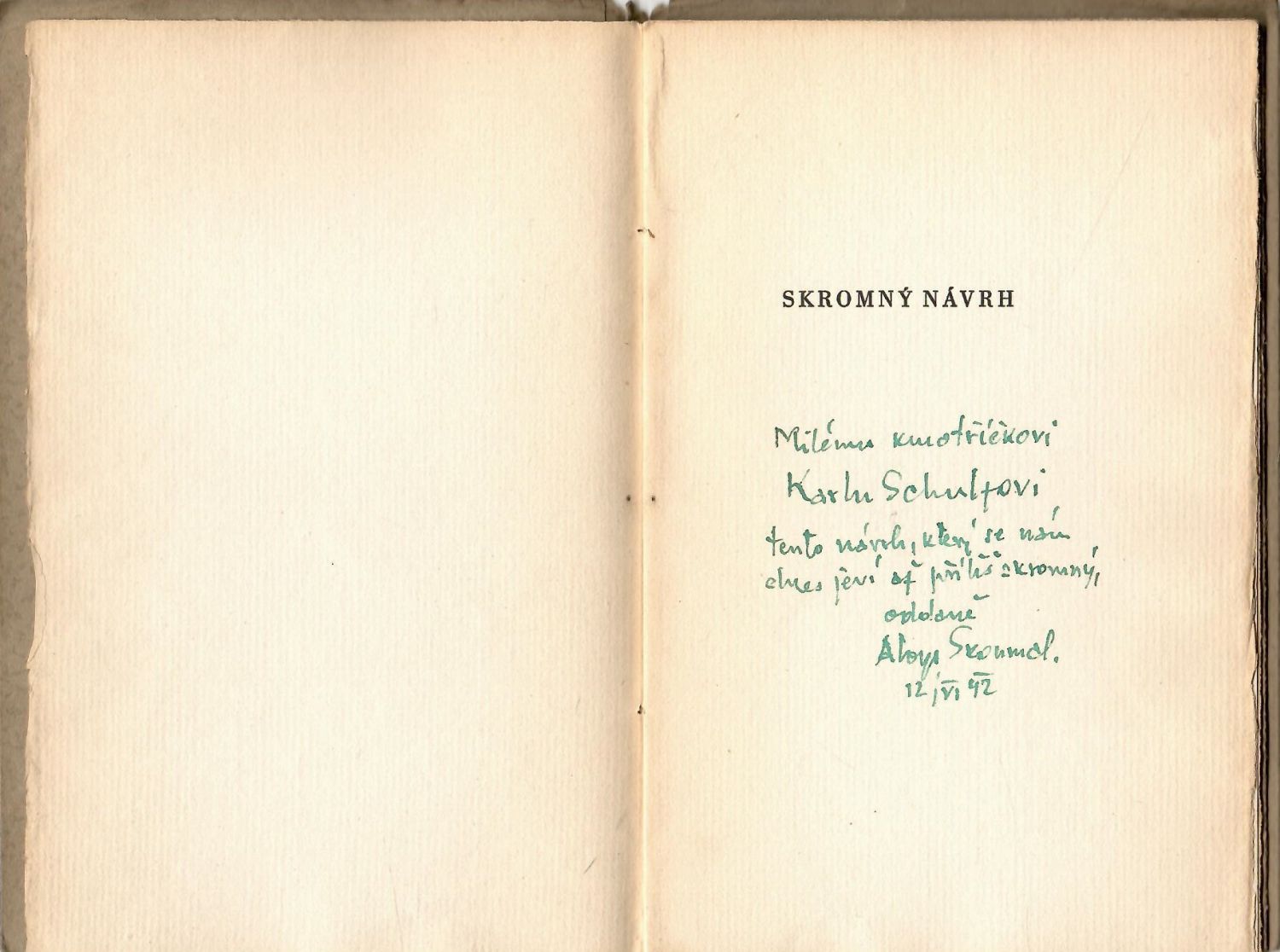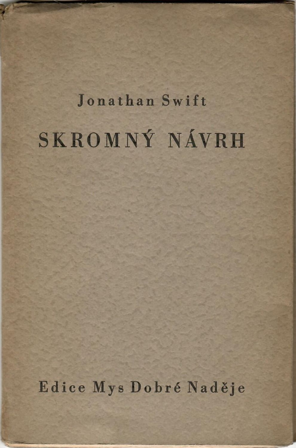Ex. č. 52 ze 66 vydaných a tištěných písmem Bodoni na Zandersův papír. Přeložil Aloys Skoumal a vytiskli Kryl a Scotti v Novém Jičíně. Ve front. v oválném zrcadle reprodukce autorova portrétu. - Původní pap. obálka s chlopněmi, při horním okraji hřbetu v délce cca 2 cm natržená. - Na patitulu rkp. dedikace zeleným inkoustem "Milému kmotříčkovi Karlu Schulzovi tento návrh, který se nám dnes jeví až příliš skromný, oddaně Aloys Skoumal 12/VI 42". - Mistrně jízlivý a ironický návrh Swiftův, jak vyřešit bídu a hlad v Irském království.