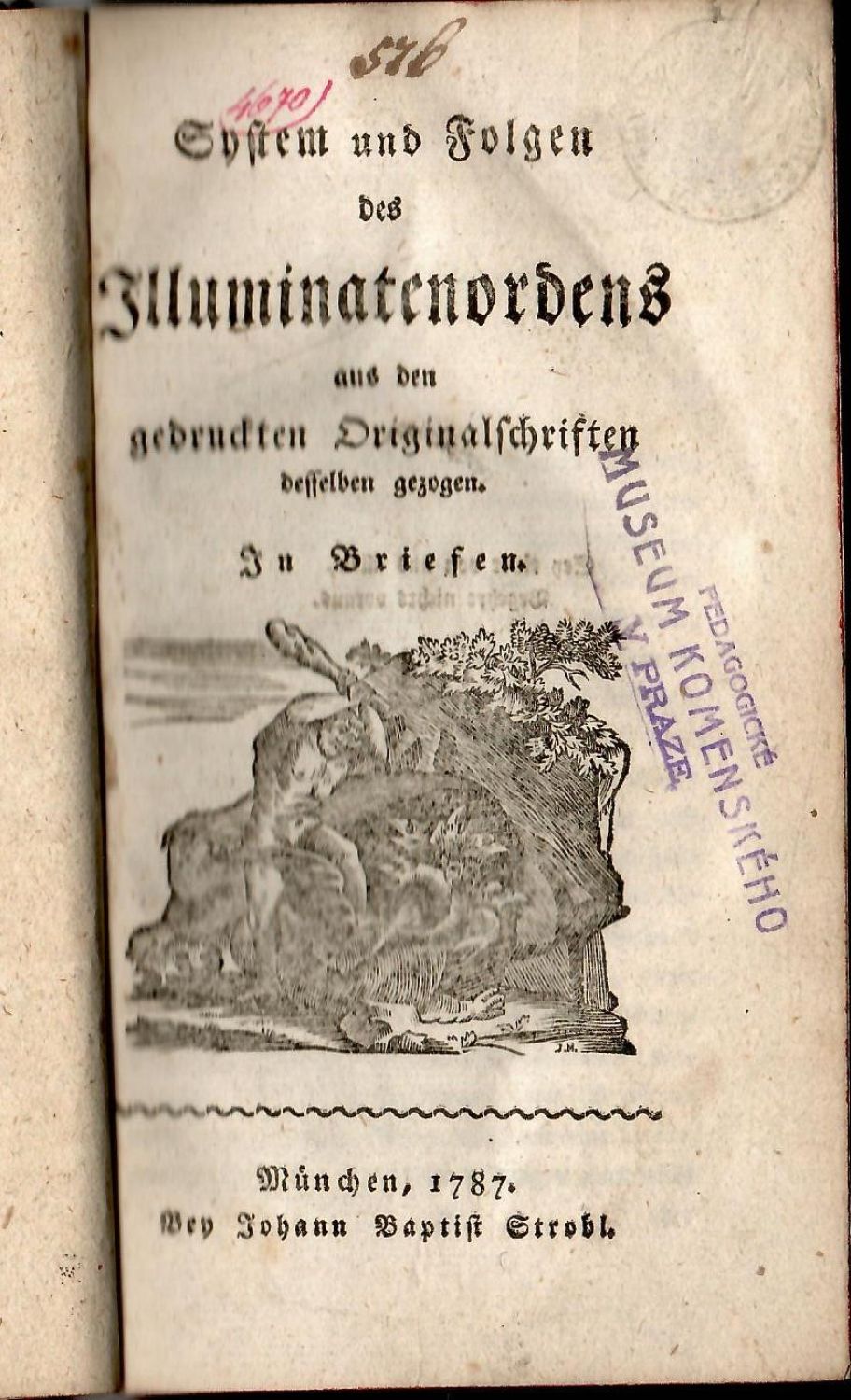 Wolfstieg II,974,42775<br>Gotika, na tit. listu dřevořezová viněta s vyobrazením muže, který palicí ubíjí dvouhlavou saň. <br>Dobová vazba z temně hnědé hověziny, ve hřbetu 5 vazů, ve druhém a třetím poli původní kožené štítky s tlačenými a zlacenými názvy, v ostatních polích tlačené a zlacené rostlinné ornamenty, červeně barvené ořízky, na přídeštích a předsádkách dobový olejový papír. Desky vazby u hřbetu zčásti prasklé, na předním přídeští nalepeno ex libris z 20.let 20. století "Společnosti Českého musea pedagogického", na tit. listu a v textu několik razítek Musea ze stejných let a několik razítek zčásti vybledlých Strahovského kláštera z konce 19. století.<br>Hnutí Iluminátů či volnomyšlenkářů bylo založeno 1. května 1776 Adamem Weishauptem na universitě v Ingolstadtu. Symbolem spolku se stala sova římské bohyně moudrosti Minervy. Spolek založený v Bavorsku měl být protipólem tamějšímu dominujícímu řádu jesuitů a alternativou k zednářským a rosenkruciánským lóžím. Roku 1777 se stal vládcem Bavorska Karel II. Teodor, který byl stoupencem osvícenského absolutismu a roku 1784 jeho vláda zakázala všechny tajné společnosti včetně Iluminátů a Svobodných zednářů. Spolek ukončil činnost v březnu roku 1785.