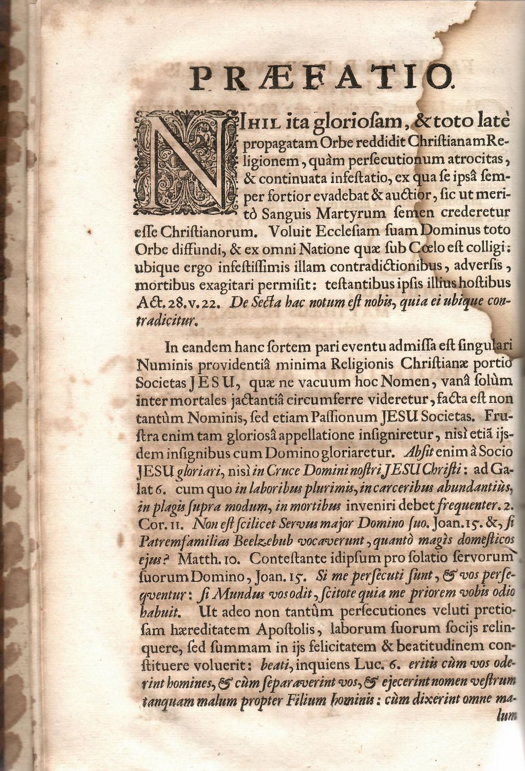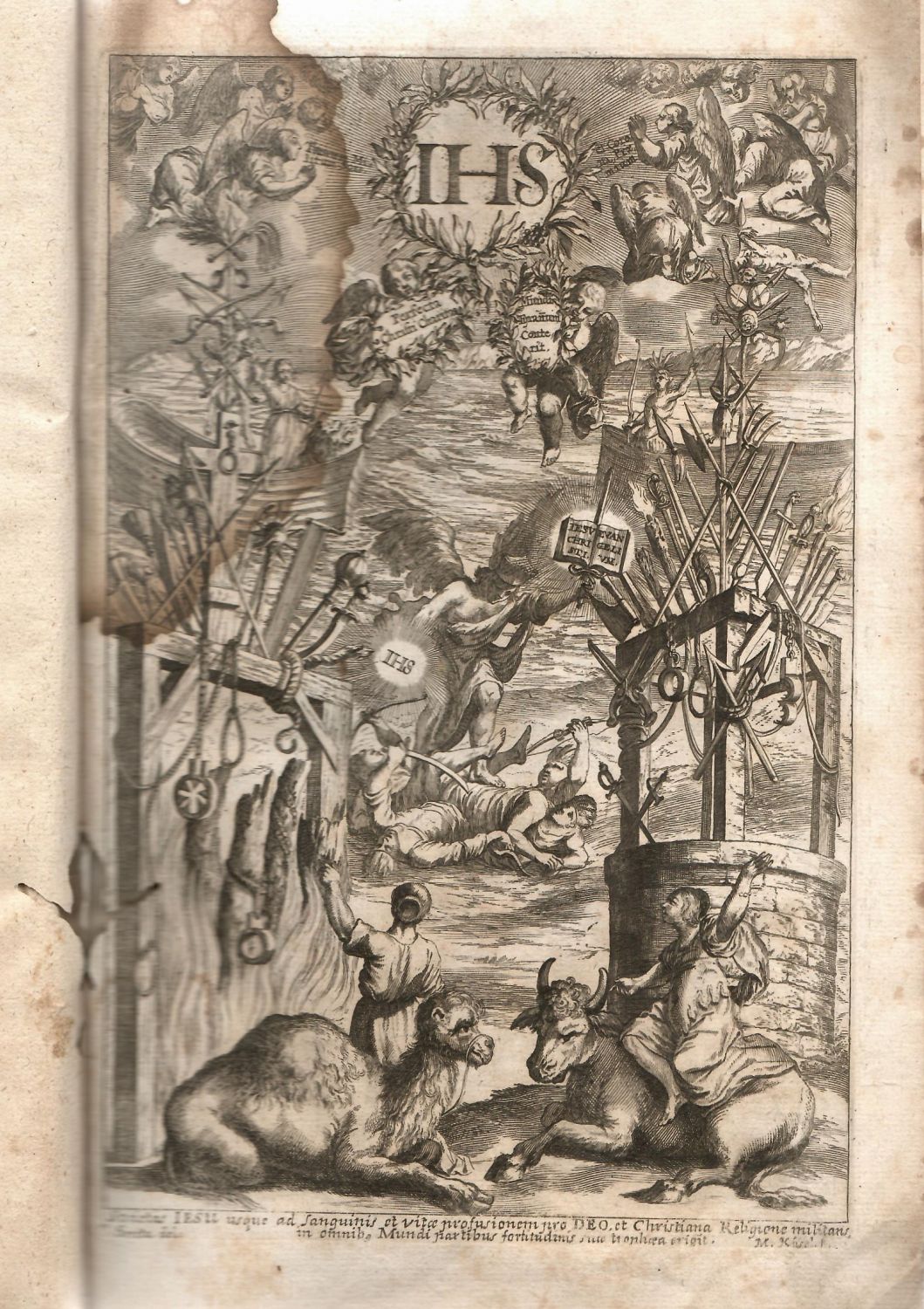 SOCIETAS JESU USQUE AD SANGUINIS ET VITAE PROFUSIONEM MILITANS, IN EUROPA, AFRICA, ASIA, ET AMERICA, CONTRA GENTILES, MAHOMETANOS, JUDAEOS, HAERETICOS, IMPIOS, PRO DEO, FIDE, ECCLESIA, PIETATE. SIVE VITA, ET MORS EORUM, QUI Ex Societate Jesu in causa Fidei, & Virtutis propugnatae, violenta morte toto Orbe sublati sunt.