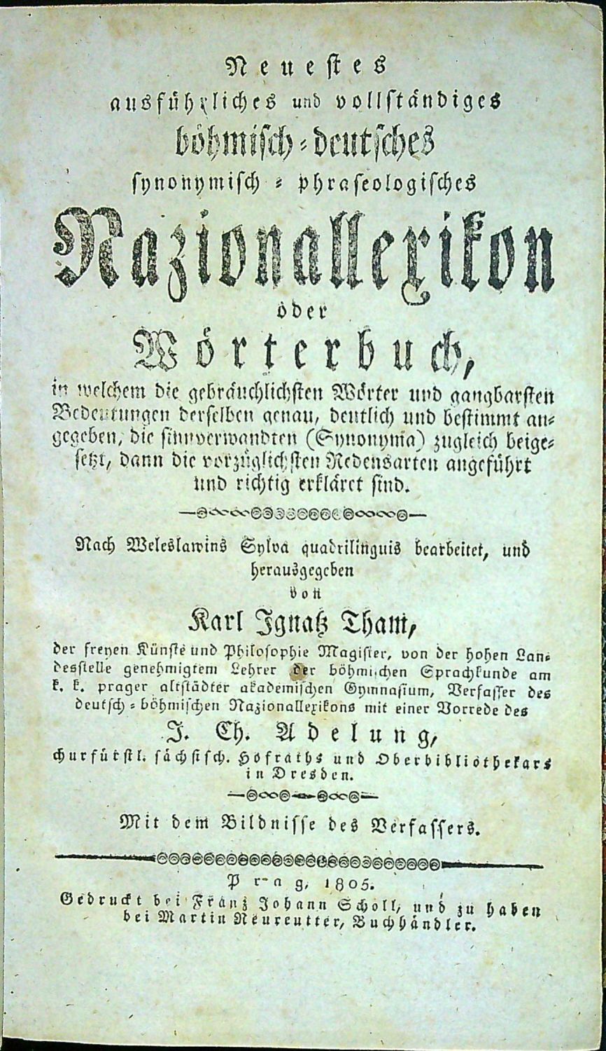Neuestes ausführliches und vollständiges böhmisch=deutsches synonymisch=phraseologisches Nazionallexikon oder Wörterbuch, in welchem die gebräuchlisten Wörter und gangbarsten Bedeutungen derselben genau, ....... Nach Weleslawins Sylva quadrilinguis bearbeitet, und herausgegeben von Karl Ignatz Tham, ....
