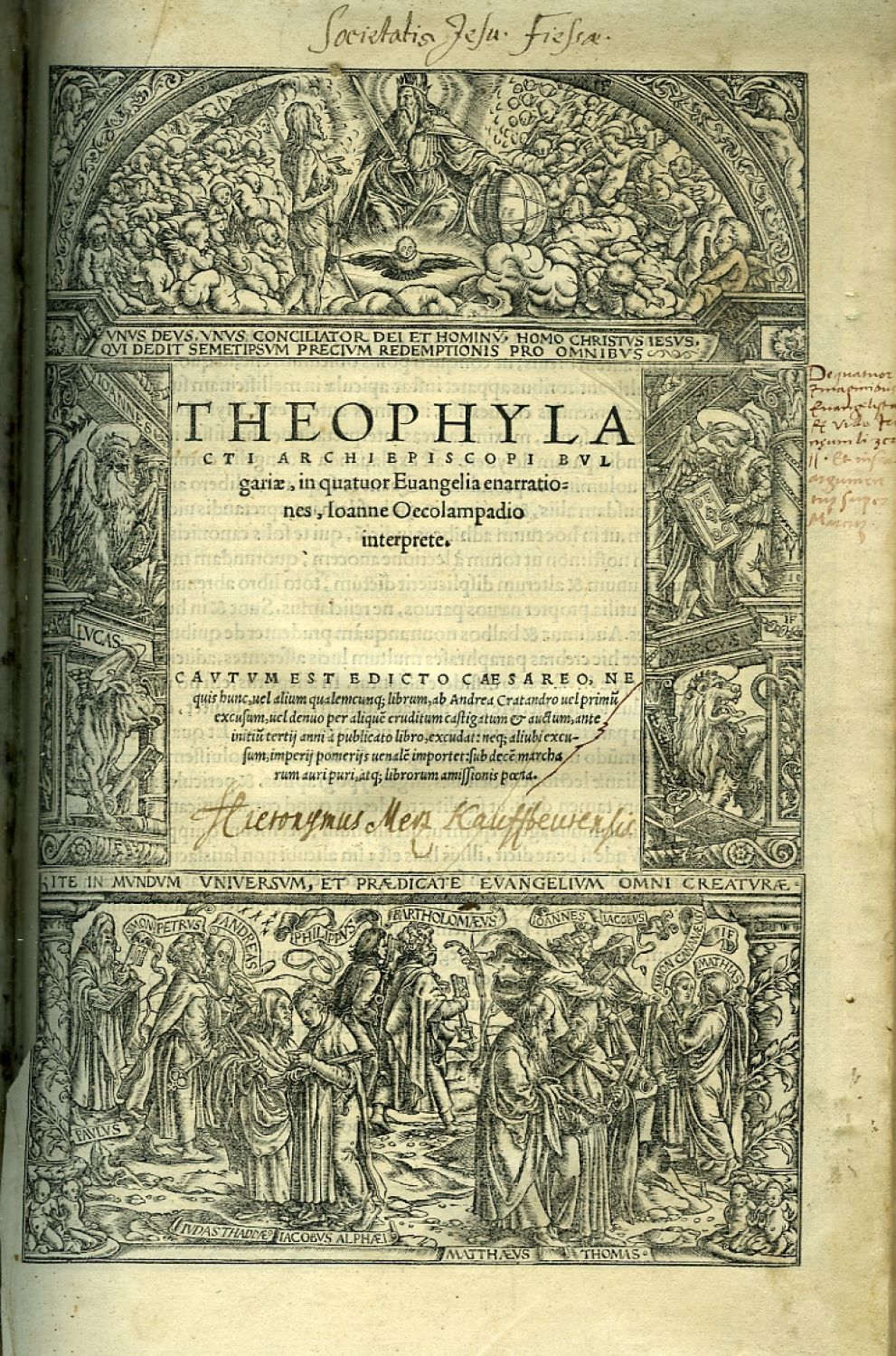 VD16 B4599; Adams II,T 586<br>Titulní list v dřevořezové borduře složené ze čtyř částí, v horní části Kristus Svatá Trojice, po stranách alegorie čtyř Evangelistů a dole dvanáct apoštolů (misionářů s klíčem k pravdě)doplněných o Pavla. V pravé a spodní borduře iniciály IF (Johannes Faber), list druhý olemovaný bordurou složenou ze čtyř částí, po stranách stylizované sloupy z amfor, svícnů, maskaronů, štítů a ornamentů, které jsou zakončeny na straně levé kulatým medailonem s hlavou muže ověnčenou ratolestí, vpravo hlavou muže s korunou, u paty levého ďábel unášející ženu, u paty pravého čert s nákladem na zádech a dětma v popředí, ve spodní části lidské orgie, část horní vyplněná ornamentální výzdobou. Krom části horní jsou též signované monogramem IF. V textu 85 konturových iniciál zalomených do výše 5 řádků, zčásti se opakujících, na rostlinném, ornamentálním pozadí. Některé s andílky, s lidskými postavami. Na listu 2b iniciála ve výši 11 řádků s postavami nahého muže a ženy, na listech 2a, 52a, 79a a 144b iniciály ve výši 6 řádků, na str. 52a, 78b a a 144b pásové vlysy, na posledním čistém listu nalepen dřevořezový signet A. Cratandera. Živá záhlaví, tištěné poznámky po stranách, široké okraje (knižní blok neoříznutý).<br>Dobová renesanční vazba ze světlé vepřovice zdobené slepotiskem, na přední desce dva původní tepané kovové úchyty, na zadní dvě původní kožené přezky s kovovými tepanými sponami, ve hřbetu čtyři vazy, vazba ohmataná a místy odřená. Titulní list při spodním vnitřním okraji cca v délce 7 cm odtržený od vazby, na několika listech při spodním okraji stopy od vlhkosti, list 195 při vnějším okraji po celé výši přilepený, přesto ve stavu velmi dobrém. Na titulním listu rkp. záznam o provenienci - při horním okraji "Societatis Jesu Fiessa.", nad spodní bordurou "Hieronymus Marz Kauftbewensis". Po stranách textu řada dobových rkp. marginálií.<br>Theofylactus, byzantský teolog, arcibiskup v Ochridě. Narodil se v první polovině 11. století. Nabízené dílo je prvním ze čtyř vydání vydaných A. Cratanderem v Basileji, které přeložil a komentářem opatřil Johann Oecolampadius, švýcarský protestantský reformátor.