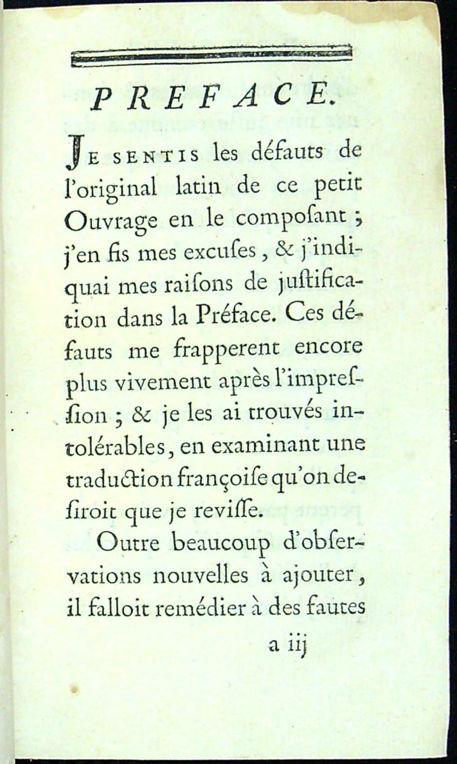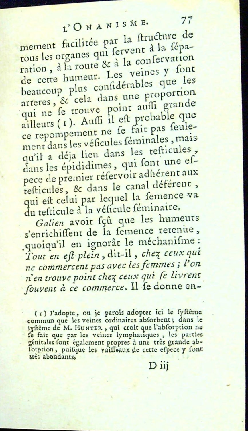 Hirsch V,594-95; Waller 9613<br>Na tit. listu drobná viněta, neživá záhlaví, vstupní pásový vlys z drobných ornamentů, tučně tištěné versálky.<br>Dobová vazba s karto. deskami potaženými mramorovaným papírem, kožený hřbet a nárožnice, ve hřbetu 5 vazů, ve druhém poli původní světlý kožený štítek s tlačeným názvem, červeně barvené ořízky. Vazba místy lehce odřená, naražené rohy, při horním okraji stran světle hnědé drobné mapky od vlhkosti (do strany 90), na několika listech při vnitřním okraji drobné cestičky od červotoče. <br>Samuel Auguste André David Tissot (20.3. 1728 Grancy - 13.6. 1797 Lausanne), významný švýcarský lékař, neurolog a profesor. Nabízené dílo vydal poprvé roku 1760, v práci autor píše o škodlivých účincích masturbace, sperma je dle autora "esenciální olej" a "stimul", který, když se z těla ztratí ve větším množství, způsobí citelné snížení síly, paměti, rozumu, způsobuje rozmazané vidění, nervové poruchy, dnu a revmatismus. Pojednání mělo velký vliv po dvě století na vnímání masturbace v západní evropské medicíně (jeho argumenty byly mimo jiné uznány a šířeny i Kantem, Voltairem...) jako škodlivé a vysilující nemoci.