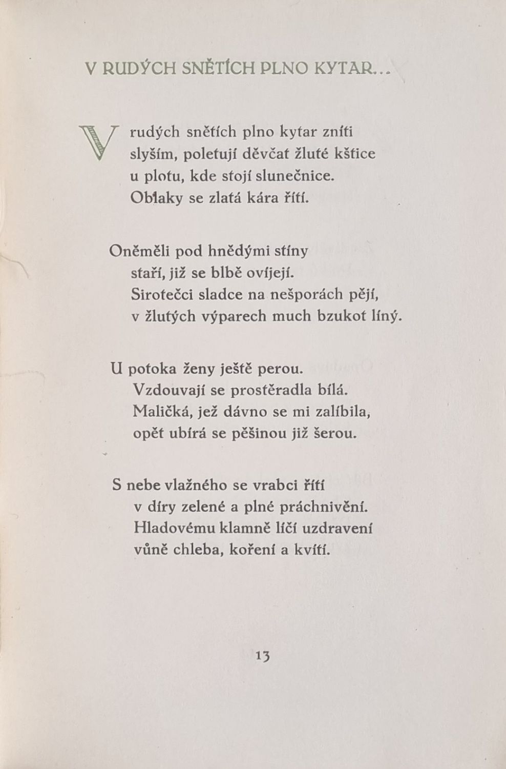 Jeden ze 350 vydaných a nečíslovaných exemplářů (krom toho bylo vydáno 50 výtisků na ručním papíře). Dvoubarevně tištěný titulní list, zeleně tištěné názvy jednotlivých básní a a iniciály zalomené do výše 2 řádků. Knihu upravil Josef Marek a vyzdobil vinětou na tit. listu, přeložil Bohuslav Reynek a vytiskl František Obzina ve Vyškově. - Kartonové desky potažené vínově červeným semišem, na předsádkách a přídeštích olejový papír z konce 20.let. Vloženy původní nakladatelské letáčky s anotací knihy.