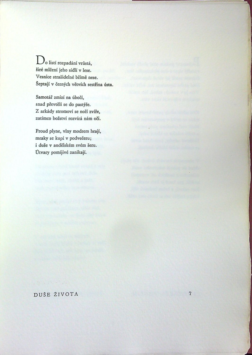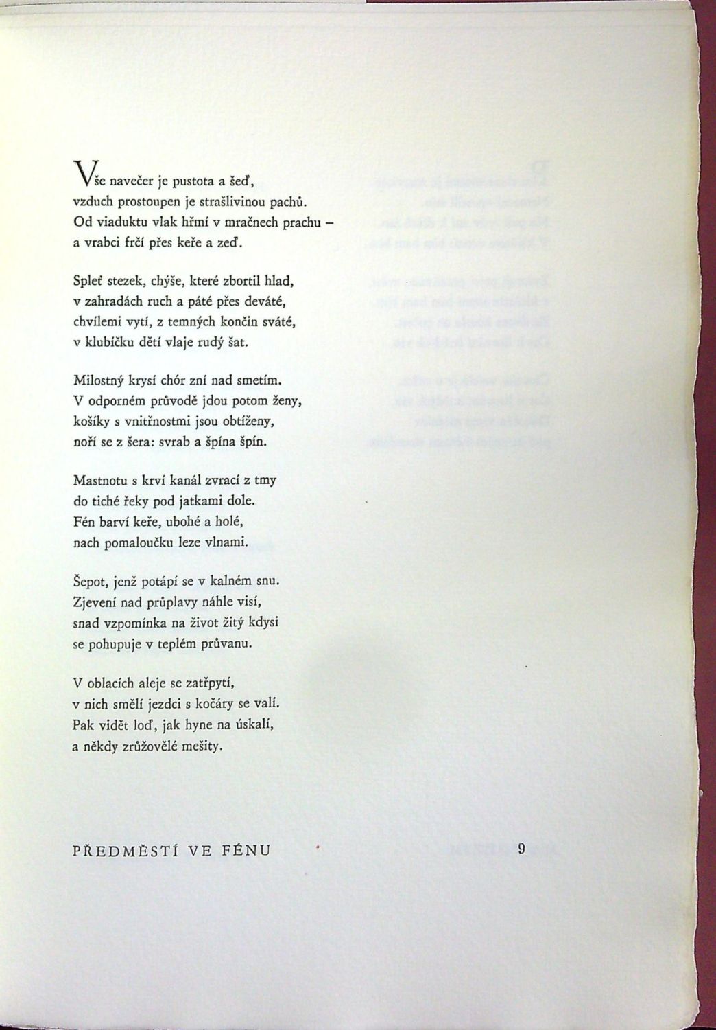 Jeden z 300 výtisků bez ilustrací, který vydal PNP k 100. výročí narození G. Trakla jako subskribční tisk pro členy Spolku českých bibliofilů. (Krom toho vyšlo 200 výtisků se 4 suchými jehlami J. Klápštěho). Písmem cicero Garamond na velkolosinský přírodní papír vytiskly Moravské tiskařské závody. Upravil a obálku navrhl Martin Dyrynk. - V původní obálce volně vložený, složený knižní blok.