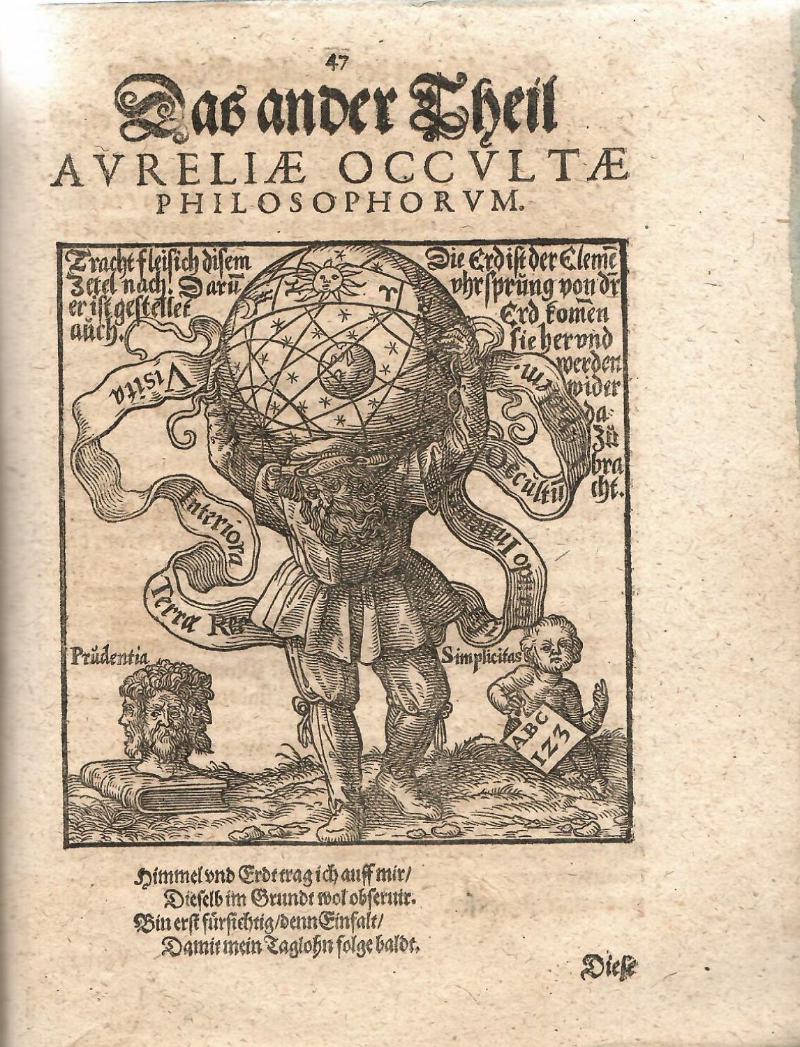 Hogart "Alchemy" 23; Fergusson II, str. 150-151.<br>Tištěno gotikou, latinská slova jména antikvou, signatury, stránkové kustody, živá záhlaví, červeno-černě tištěný titulní list. Iniciály ve výši 3 řádků, iniciály s propletenými úponky ve výši 5-6 řádků, pásové vlysy rostlinného ornamentu. V textu 13 dřevořezů alegorického obsahu, za každým vyobrazením vysvětlující text, zčásti ve verších. Kniha se skládá ze dvou částí, od strany 47 druhá část s názvem "AVRELIAE OCCVLTAE PHILOSOPHORVM". Na hlavním titulním listu dřevořez datovaný 1605 s vyobrazením Seniora (starce) a Adolfa (mladého studenta), účastníky dialogu, který tvoří první část díla. Na druhém titulním listu dřevořez (108 x 100 mm) s alegorickým vyobrazením Atlasu a vysvětlujícím textem. Na straně 50 dřevořez s vyobrazením "smaragdové tabule".<br>Papírová obálka z 18. století, titulní list zašpiněný a na dvou místech vyspravený podlepením (při horním vnějším okraji a při vnitřním okraji pod hlavním titulem - původně natrženo). Modře barvené ořízky.
