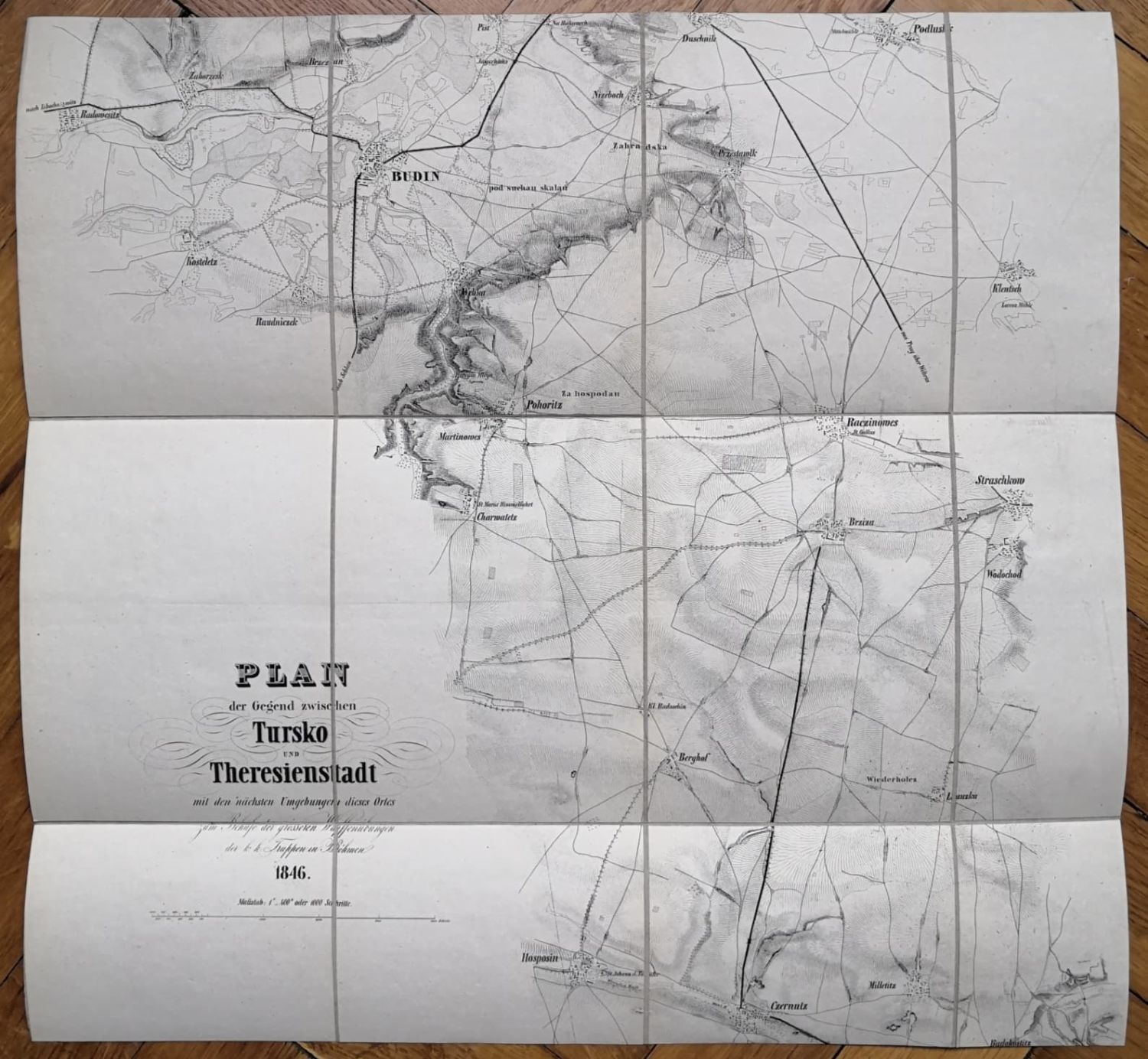 1) "Plan der Gegend zwischen Tursko und Theresienstadt mit dem nächsten Umgebungen dieses Ortes zum Behufe der grösseren Waffenübungen der k. k. Truppen in Böhmen 1846." Rozkládací mapa, na plátně v sekcích nalepená, ve 3 částech (490 x 510 mm, 500 x 510 mm, 520 x 570 mm).<br>