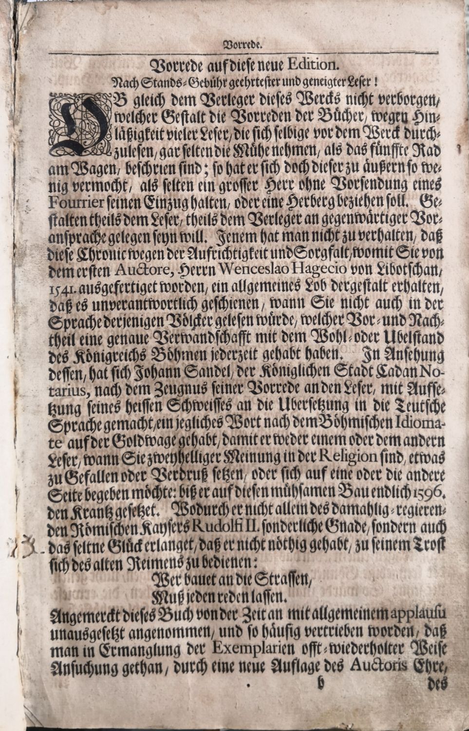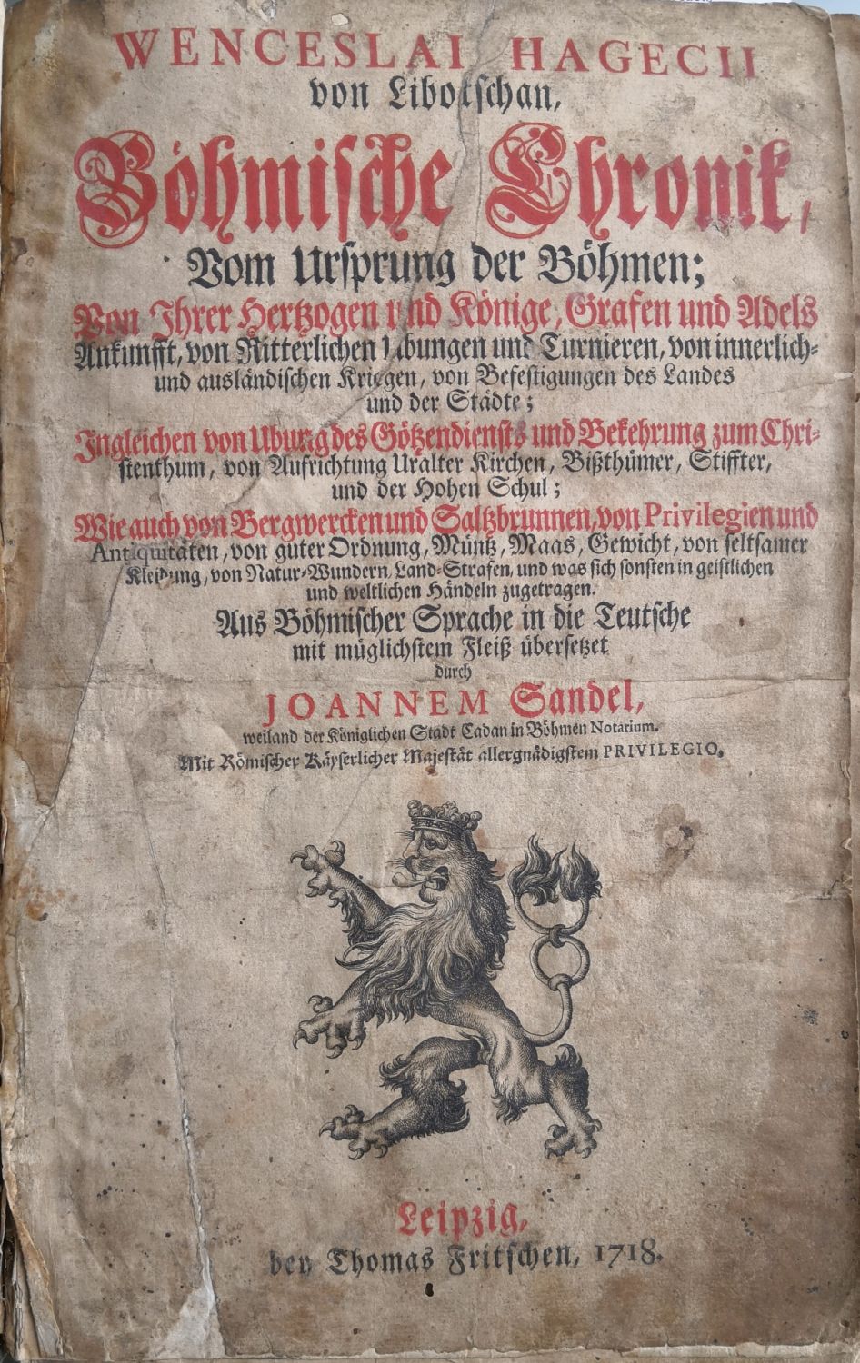 Böhmische Chronik, WENCESLAI HAGECII von Libotschan, Böhmische Chronik, Vom Urpsprung der B§ohmen; Von Jhrer Hertzogen und Könige, Grafen und Adels Ankunfft, ... Aus Böhmischer Sprache in die Teutsche mit müglichstem Flei3 übersetzet durch JOANNEM Sandel, weiland der Königlichen Stadt Cadan in Böhmen Notarium ...