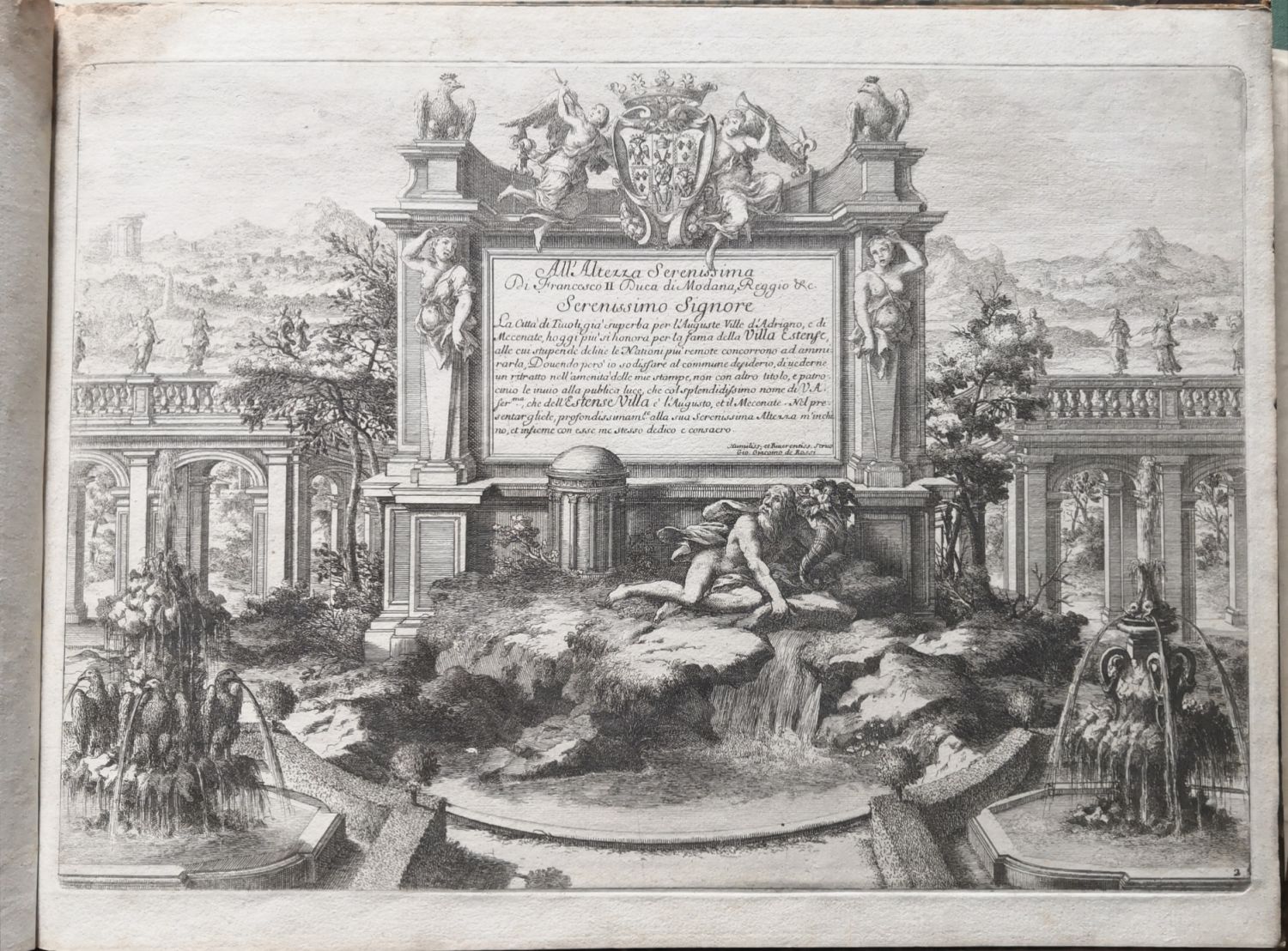 Le Fontane del Giardino Estense in Tivoli con li loro prospetti, e vedute della cascata del fiume Aniene. Designate, et intagliate da Gio. Francesco Venturini. Parte Quarta. Data in luce da Gio. Giacomo de Rossi nella sua stamperia, in Roma alla Pace, all´Insegna di Parigi con Priu. del S. Pont.