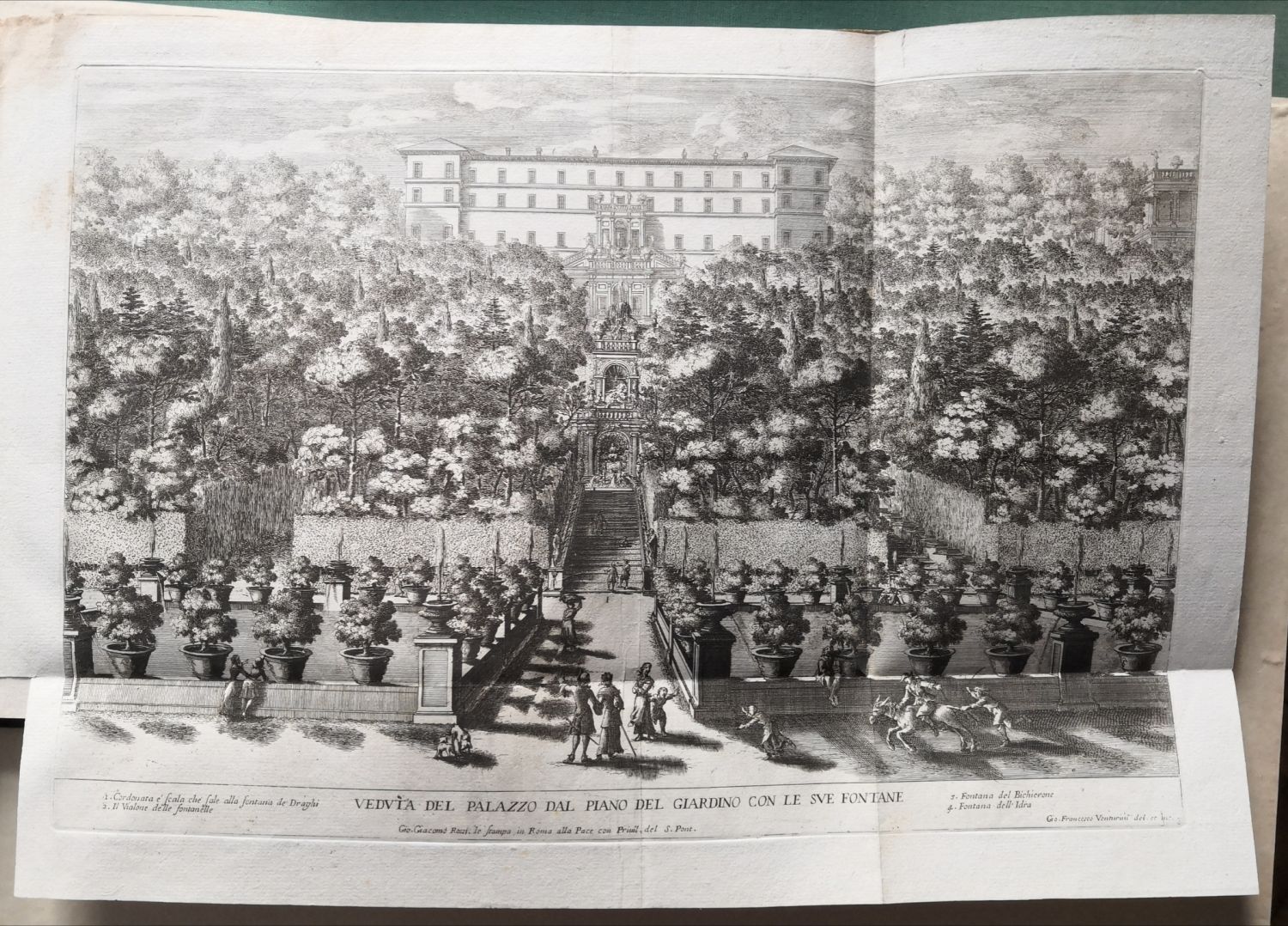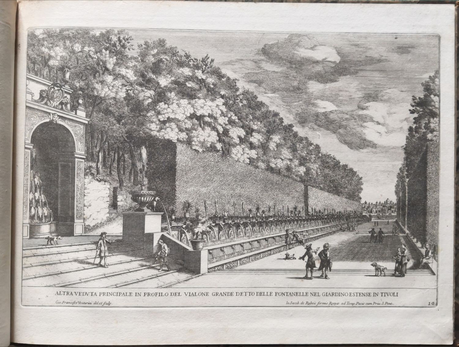 Kat. der Ornamentstich-Slg. Berlin 3603; Jessen 1480<br>Do mědi rytý titulní list, do mědi rytá alegorie s věnováním Francescu II. knížeti z Modeny a Reggia, 26 do mědi rytých a částečně leptaných celostránkových vyobrazení fontán umístěných v zahradách a grottách renesanční vily "d´Este v italském Tivoli nedaleko Říma. Všechny tabule, včetně tit. listu a listu dedikačního jsou číslovány 1-28. Tabule tři (nečíslovaná) je rozkládací (345 x 510 -rozměr papíru, 300 x 445 - rozměr rytiny) s vyobrazením celkového pohledu na palác se schodištěm a zahradou. Ostatní rytiny mají rozměr cca 230 x 340 mm, pod každým listem je rytý vysvětlující text se jménem rytce a vydavatele. Podlouhlé folio o rozměru 290 x 375 mm.<br>Dobová polokožená vazba, kartonové desky potažené olejovým papírem s koženým hřbetem a nárožnicemi. Ve hřbetu šest polí oddělených zlaceným a tlačeným zdobným pásem, ve druhém poli tlačený a zlacený název, v ostatních polích tlačená a zlacená květina, při horním i spodním okraji hřbetu pás dvojitý. Vazba lehce ohmataná a místy mírně odřená, na přední desce nalepený starý pap.knih. štítek. Na titulním listu, na jeho rubu a při spodním okraji listu 17 staré razítko Kabinetu pro theorii a dějiny umění ČSAV v Praze (přiloženo potvrzení Ústavu dějin umění Akademie věd v Praze z 20.1. 2016, že kniha byla dne 5.6. 1980 na základě schváleného Soupisu publikací k vyřazení z knihovny vyřazena). Při horním vnitřním okraji listů hnědé skvrny způsobené vlhkostí.<br>Villa d´Este postavená v renesančním slohu představuje jednu z vrcholných ukázek italské klasické i zahradní architektury. <br>Giovanni Francesco Venturini (1650 Řím - 1710 Řím), italský barokní malíř a rytec.<br>Giovanni Giacomo Rossi (1627-1691), významný italský tiskař a rytec v Římě.