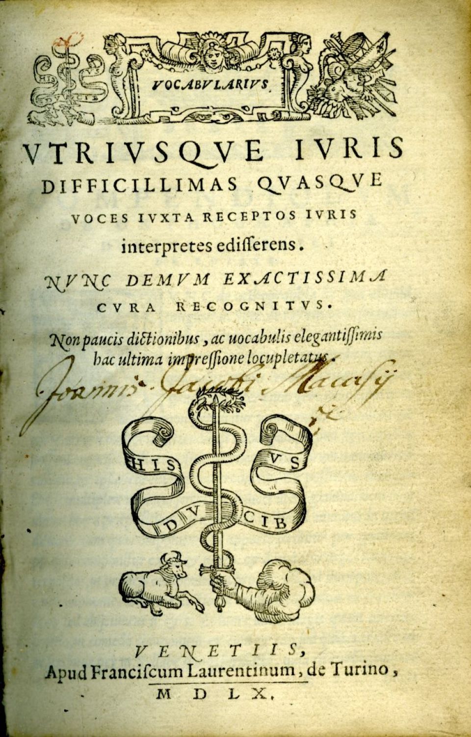 VOCABULARIUS UTRIUSQUE JURIS DIFFICILLIM QUASQUE VOCES JUXTA RECEPTOS JURIS interpretes edifferens. NUNC DEMUM EXACTISSIMA CURA RECOGNITUS. Non paucis dictionibus, ac vocabulis elegantissimis hac ultima impressione locupletatus.