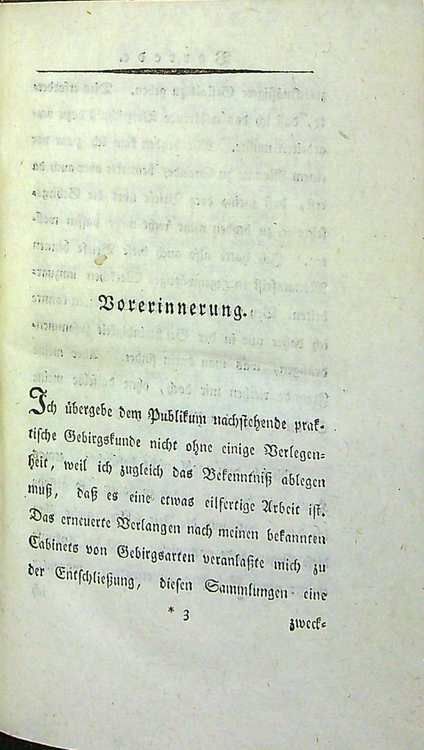 Tištěno švabachem, živá záhlaví.<br>Dobová kartonová vazba potažená olejovým papírem, při horním okraji hřbetu dobový kožený štítek s tlačeným a zlaceným názvem, pod ním tlačená a zlacená ornamentální ozdůbka, barvené ořízky. Vazba ohmataná a místy odřená, naražené rohy.<br>Johann Carl Wilhelm Voigt (20.2. 1752 Allstedt - 2.1. 1821 Illmenau) byl mineralog a důlní inženýr.