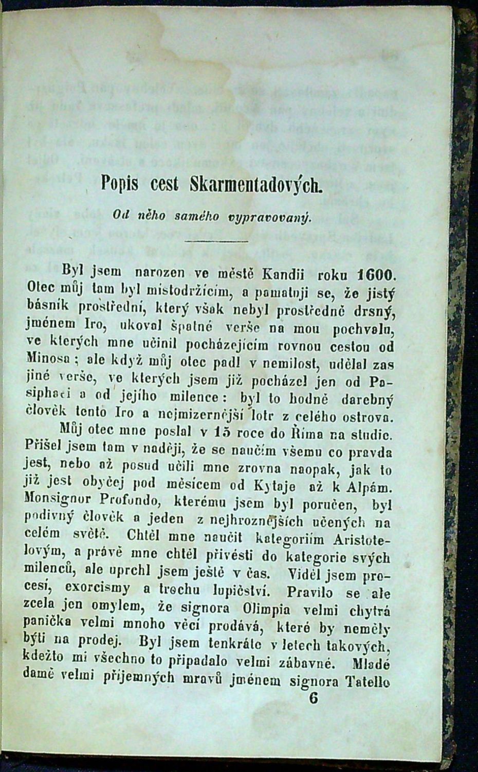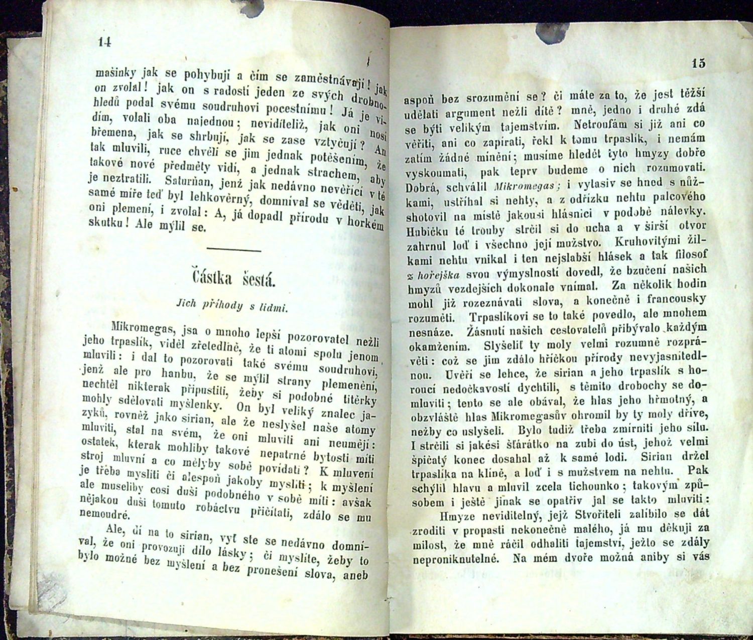 Antikva, jednotlivé povídky a úvahy Voltairovy odděleny patituly. Ve svazku jsou mimo jiné obsaženy "Mikromegas", "Rozum na cestách", "Platonův sen", "Běloch a Černoch" ... Volně vložen dvoulist tištěný na jiném papíře s předmluvou Karla Havlíčka Borovského, ve které vysvětluje proč nemohla kniha vyjít pod jménem autorovým, na druhém listu dvoulistu obsah.<br>Dobová kartonová vazba s plátěným hřbetem, ohmataná a místy odřená, naražené rohy. Papír zahnědlý a místy světle hnědé mapy způsobené vlhkostí. Na předním přídeští rkp. poznámka perem sběratele Rudolfa Hlavy z roku 1961 se vztahem ke knize. <br>Jedná se o prvý překlad do českého jazyka, který Havlíček pořídil z francouzského vydání, vydaného ve Vídni roku 1810 v době policejního absolutismu. Pro Čechy je zvláště ostudné, že několik překladů z Voltaira vyšlo již ve století osmnáctém v ruštině, polštině a maďarštině.