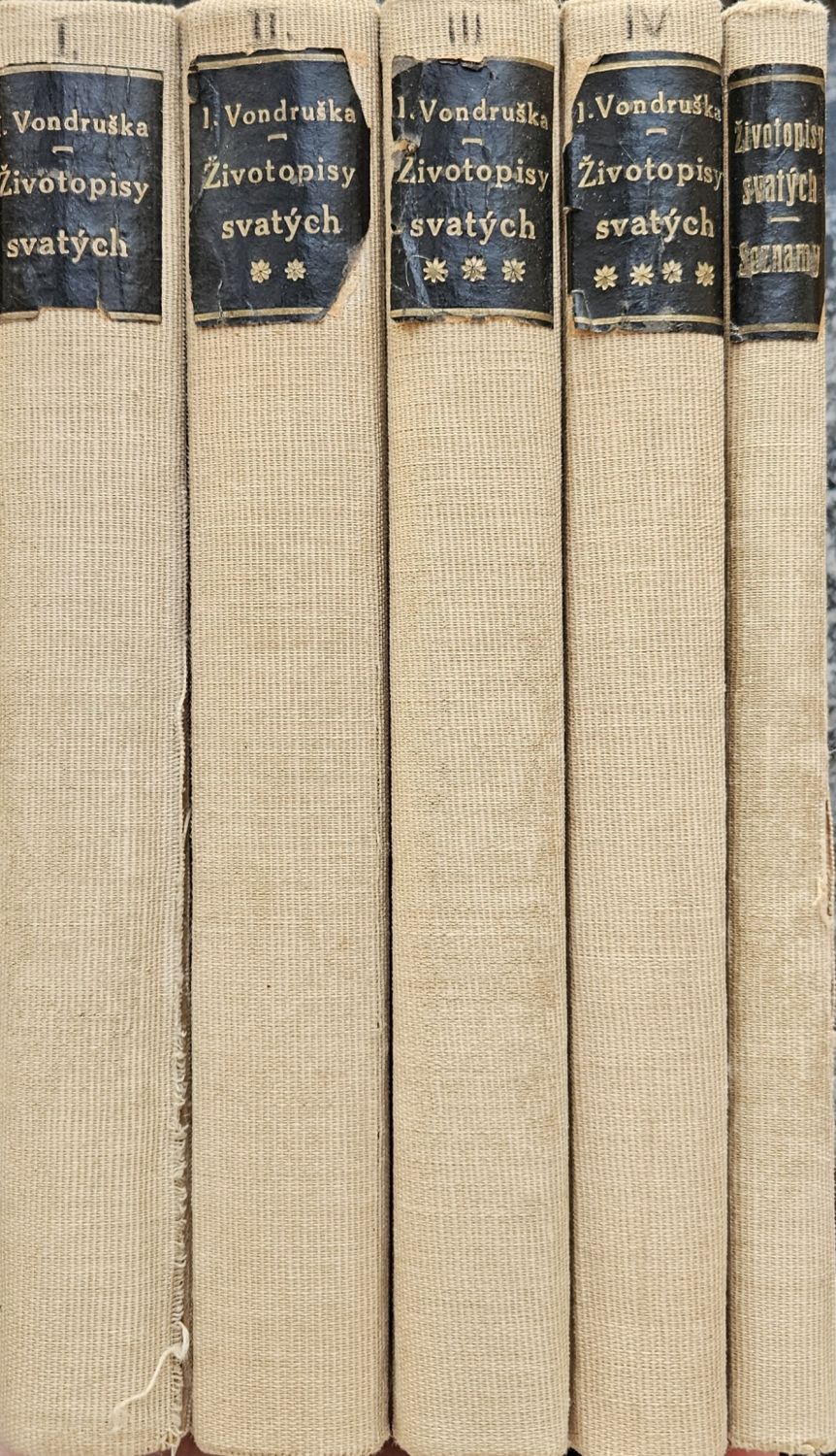 Životopisy svatých v pořadí dějin církevních I. - IV. díl, Kalendarium svatých s ukazatelem životopisů V. díl.<br>Desky všech pěti dílů potaženy světle hnědým plátnem. Při horním okraji hřbetů nalepeny původní kožené štítky s tlačeným a zlaceným názvem, štítky zkrabatělé a některé potrhané, u prvního a pátého dílu plátno u hřbetu natržené. Na předních přídeštích nalepené dvě vlastnické ex libris (Dr. M.S. a Zdirad Čech).