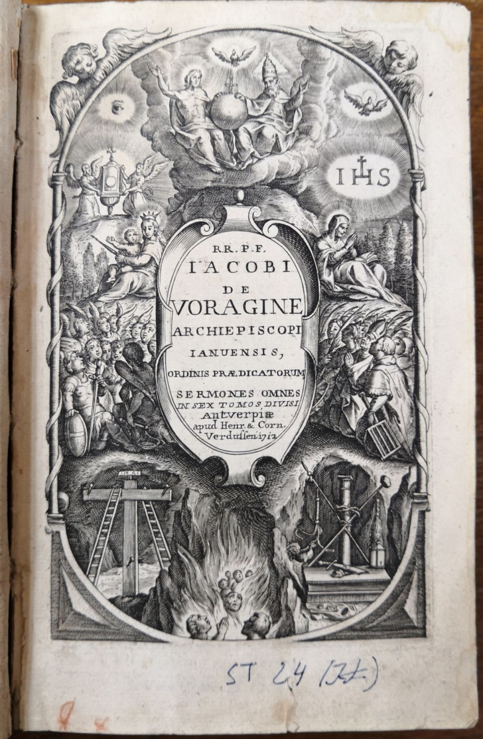 Do mědi rytý předtitul s vyobrazením pekla, očistce a ráje pod dohledem božím, na rubu tit. listu mědirytina s vyobrazením vlády a spravedlnosti nad skálou víry. Konturové iniciály na ilustrativním pozadí zalomené do výše 5-6 řádků, tištěné poznámky, tučně tištěné versálky ve výši 2-3 řádků, koncová viněta. Tomus II: Voragine "SERMONES IN DOMINICAS ET FESTA PER ANNUM. Alias illustrati studio R.P.F. RUDOLPHI CLUTII, Ordinis Praedicatorum Sacrae Theologiae Baccalaurei. Nunc vero diligentissime a mendis purgati. CUM NOVO INDICE SERMONUM, Rerum & Verborum locupletissimo" Antverpiae, Henric + Cornel Vedussen, 1709. Viněty, konturové iniciály na rostlinném pozadí, tištěné poznámky.<br>Dobová vazba s bukovými deskami potaženými světlou vepřovicí zdobenou slepotiskem. Vazba zašpiněná a ohmataná, zadní dřevěná deska rozlomená, na zadní desce otvory po nedochovaných úchytových přezkách. Na předním přídeští nalepeno exlibris Dr. Jos. Kratochvíla, na předtitulu propisovací tužkou číslo a monogram. Na přední předsádce rkp. poznámky perem v německém jazyku z 18. století, na tit. listu začerněné vlastnické jméno z 18. století. Papír místy zahnědlý, na několika listech nažloutlé skvrny.<br>Rudolph (či Rodolphe) Cluyt (po polovině 16. století - zemřel roku 1630 v Kolíně nad Rýnem) byl německý teolog, dominikánský mnich v klášteru v Cáchách, k vydání připravil a poznámkami opatřil řadu Voraginových kázání a také jeho nejslavnější dílo "Legendu Aureu".