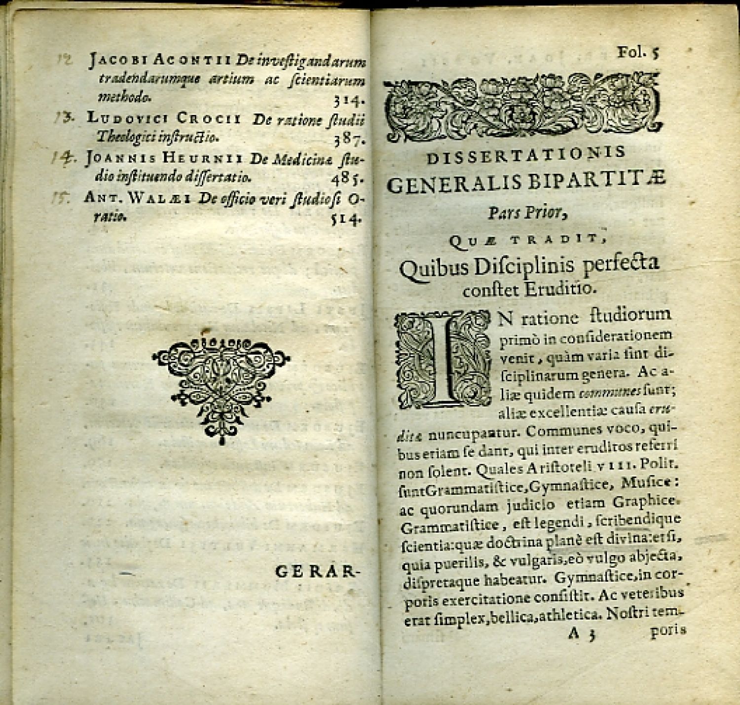 Na tit. listu viněta, konturové iniciály na rostlinném pozadí ve výši 5-6 řádků, pásové vlysy, viněty, živá záhlaví, místy tištěno kursivou. - Dobová pergamenová vazba, zašpiněná, barvené ořízky. Na předním přídeští přípis perem z 18. století, na tit. listu vybledlé provenienční přípisy.<br>Gerhard Johannes Voss, latinsky Vossius (1577 Heidelberg - 1649 Amsterdam), byl holandský teolog, filolog a historik. V nabízeném sborníku je krom tří prací Vossia zastoupen šesti příspěvky Justus Lipsius, a po jednom příspěvku Hermann Vultejus, Aegidius Mommerius, Jacob Acontius, Ludovic Cricius, Joannes Heurnius a Ant. Walaeius.