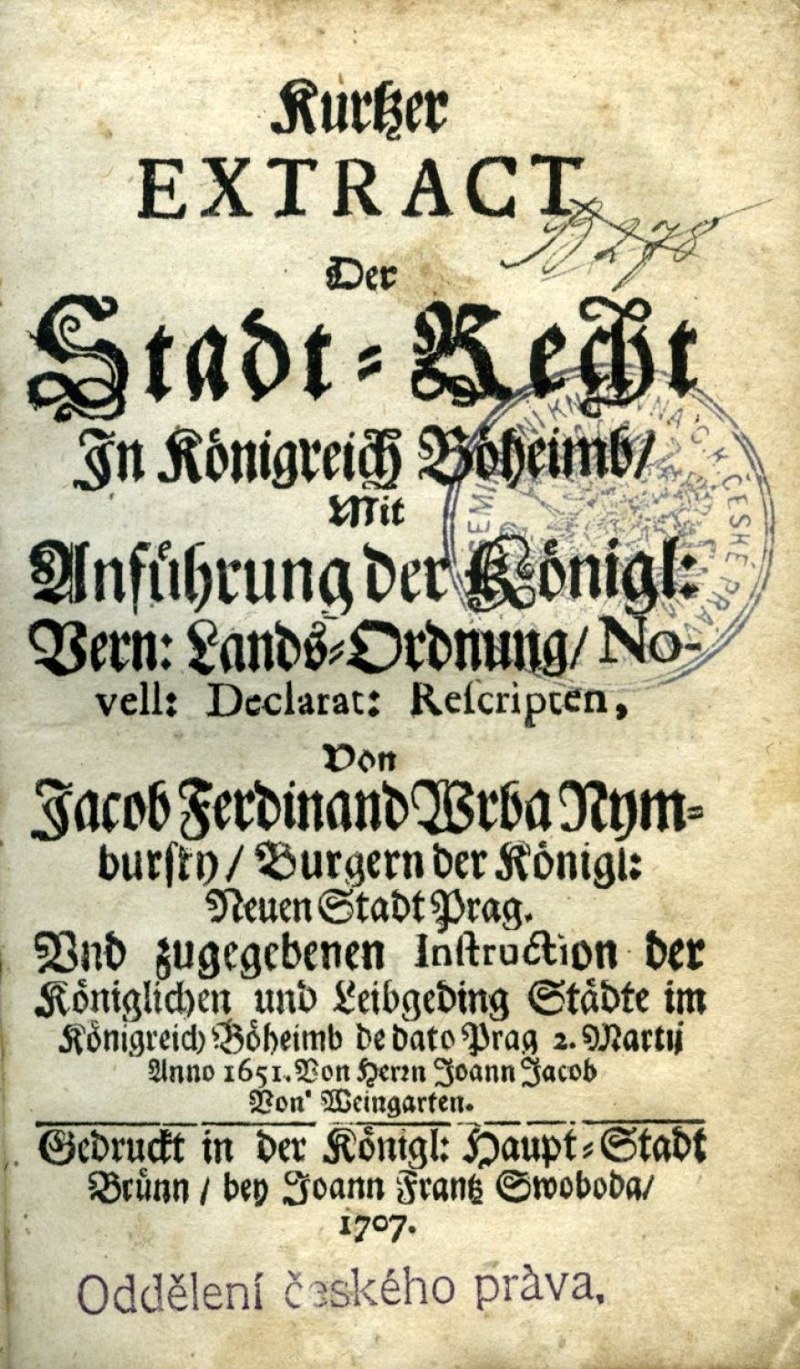 Pumprla IX,4924<br>Německý text gotikou, latinský antikvou, signatury, stránkové kustody, arabské číslování stran uprostřed horního okraje v kulatých závorkách a mezi ozdůbkami z kvítků, plné iniciálky ve volném prostoru zalomené do výše dvou řádků, úvodní iniciála propletená úponky ve výši pěti řádků, zvýrazněné nadpisy kapitol, vstupní dřevořezový vlys rostlinného charakteru, viněty. Mezi str. 85-86 rozkládací příloha (dřevořezový strom života), která měla být původně mezi str. 66-68. Ve druhé, samostatně paginované části knihy titul "Manuduction Zum Recht=Procesz/ Sowohl Bey denen Höhern als Stattgerichtlichen Instantien/ im Erb= Königreich Böheimb/ und Erb= Marggraffhumb Mähren: .... Na předním přídeští nalepený pap. knih. štítek s evidenčními čísly, na přední předsádce a na tit. listu stará razítka "Seminární knihovny Právnické fakulty UK v Praze". Dobová vazba z hnědé hověziny se čtyřmi vazy ve hřbetu, ve druhém poli tlačený název, vazba ohmataná a místy zkrabatělá a odřená, naražené rohy, místy hnědé skvrnky a několik rkp. poznámek a zvýraznění perem. <br>Jakub Ferdinand Antonín Vrba (1646 ? - 1714 - ?),písař a později sekretář Karla Leopolda hraběte Caretto-Millesimo, od roku 1687 měšťan Nového Města pražského. První německé vydání vytiskl v Praze roku 1693 Jan Karel Jeřábek, roku 1691 a pak roku 1700 vyšlo české vydání pod názvem "Krátký Wejtah Práw městských ..." u pražského tiskaře Jiřího Labouna.