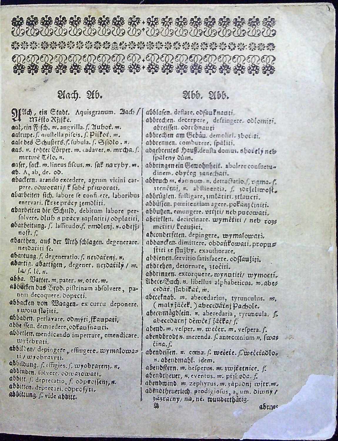 LEXICON TRIPARTITUM, Oder Teutsch=Lateinisch = und Böhmisches Wörter=Buch: In welchem nicht allein die allgemeine Wörter zu finden, sondern auch allerhand Länder, Königreiche, und Städte/ unterschiedliche Kräuter/ Bäume/ und Blumen/ mit auch bey Gereicht übliche Reden mit eingeführet seynd. Alles richtig in einem Alphabet auss unterschiedlichen Büchern/ und Lexicis, samt ihrer Art und Genere fleissiger massen zusammen getragen/ von ...