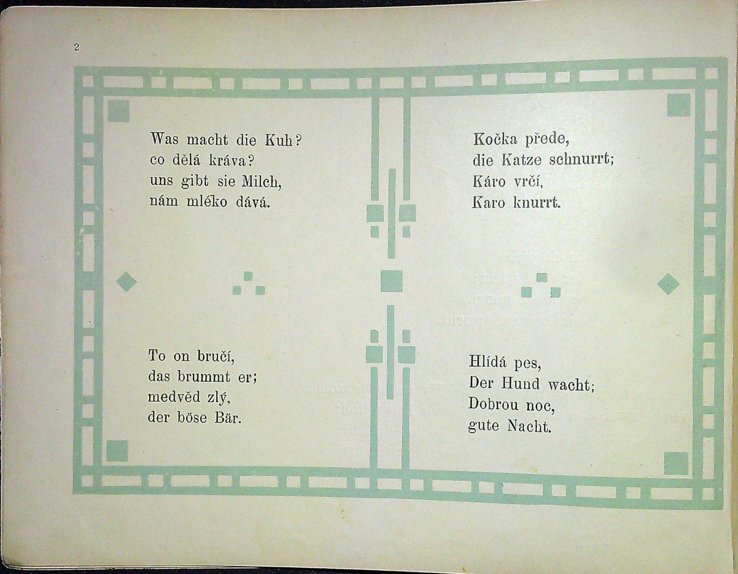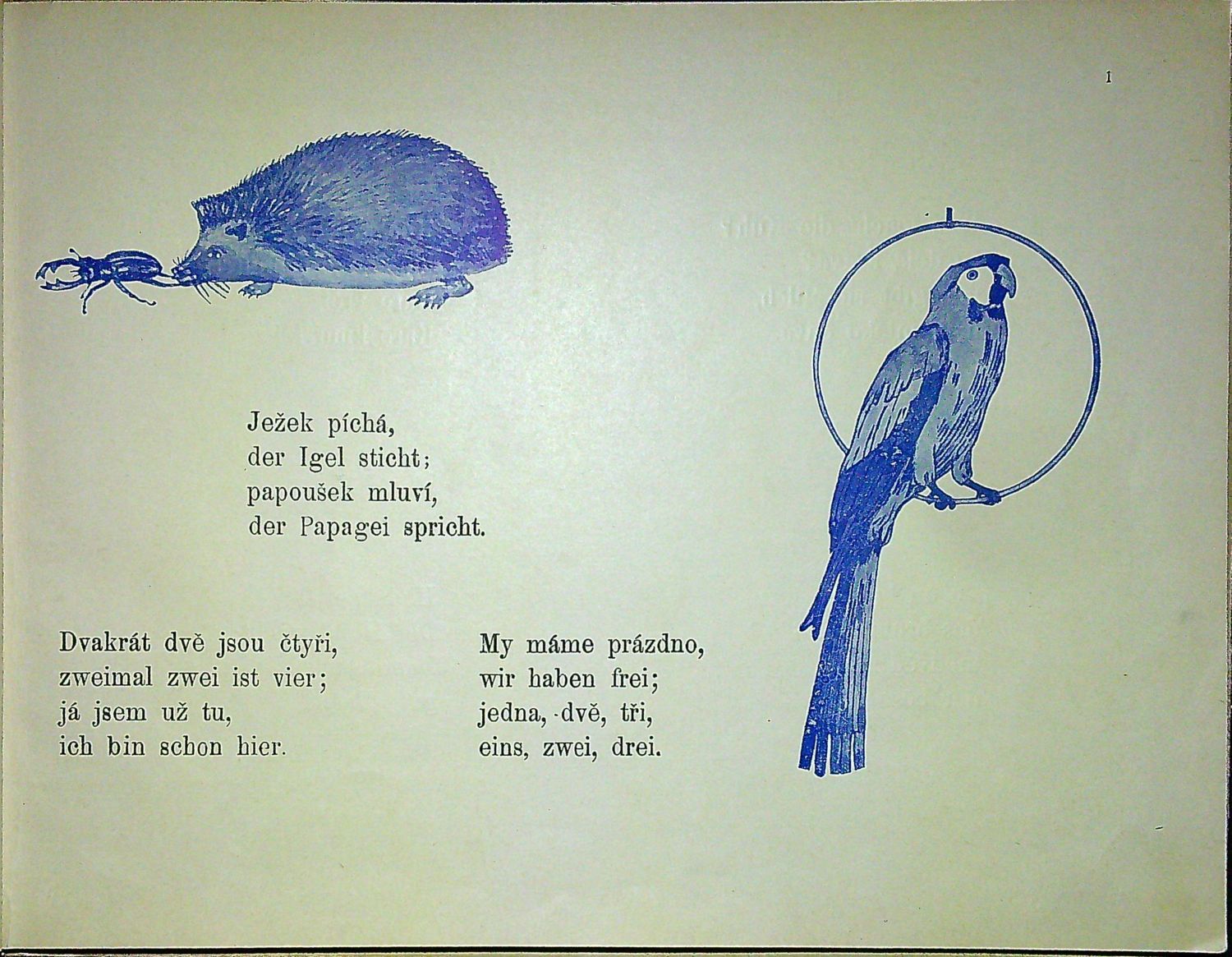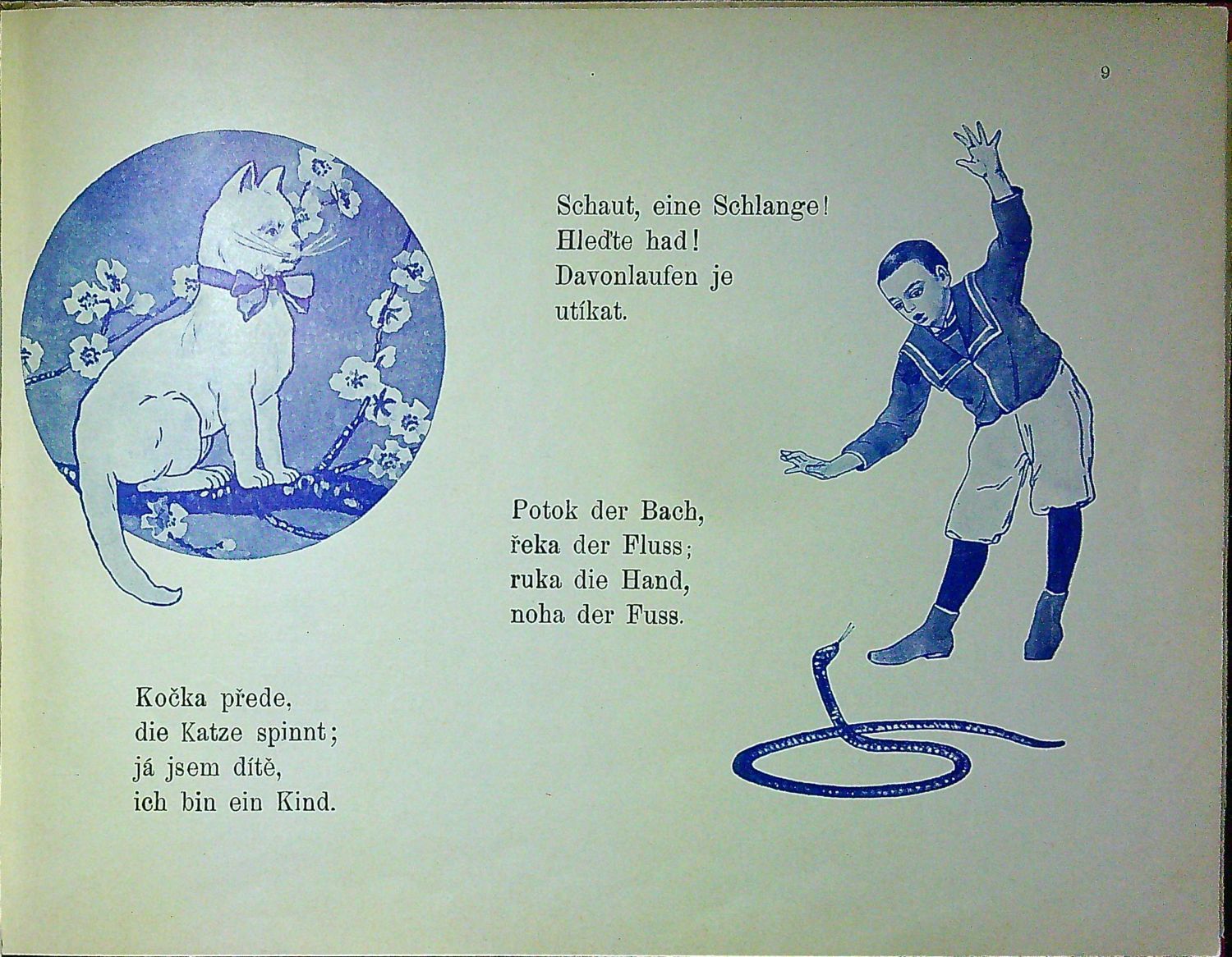 SKC vydání neeviduje.<br>Vícebarevný tisk, titulní list a sudě paginované strany bez ilustrací v zeleně tištěném geometrickém rámu, na lichých stranách modře (temně a světle) tištěné ilustrace o F. Fr. (?). - Dobová kartonová vazba, ve hřbetu přelepená červenou plátěnou páskou, na rubu předsádky a líci vakátu modře tištěný ornamentální dekor. - Přední strana desky odpadlá.