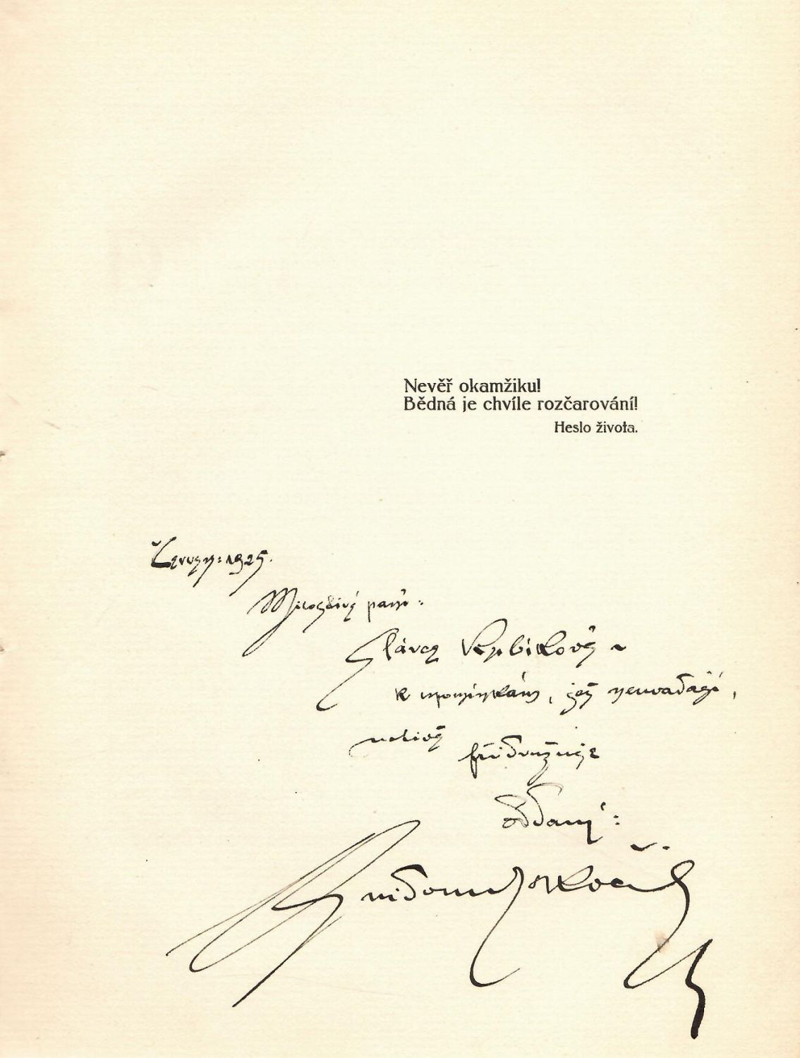 Typograficky upravil Karel Dyrynk, vytiskla tiskárna "Politika" v Praze, vstupní modře tištěná plná iniciála ve výši 3 řádků. Ve front. černobílá reprodukce autorova fotograf. portrétu. <br>Dobová vazba s kartonovými deskami potaženými papírem zdobeným drobným rostlinným ornamentem, plátěný hřbet, na přední straně vazby nalepena Bayrosova barevná ilustrace z původní pap. obálky, naražené rohy, na zadní desce při vnějším spodním okraji chybí malý kousek pap. pokryvu. - Pod tištěným motem autorova rkp. dedikace černým perem "? 1925 Milostivé paní: Slávce Vrbíkové (?) k vzpomínkám, jež neuvadají, uctivě ? Quido Maria Vyskočil".