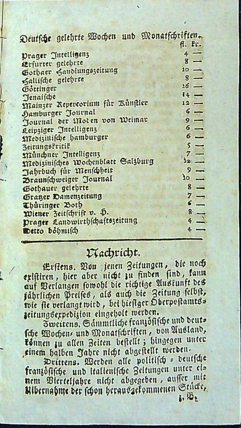 BCBT; SKC; KVK neevidují<br>Tištěno švabachem, latinské motto na rubu tit. listu, názvy francouzských, italských a anglických novin a časopisů antikvou. Na tit. listu dřevorytová viněta, dvojité linky, tučně tištěné plné iniciály. Na třetím listu (na líci i rubu) báseň "Böhmen". Na líci šestého listu začátek seznamu některých zajímavých politických a odborných časopisů a novin, které jsou k dispozici v expedici císařsko-královského pražského vrchního poštovního úřadu. Na líci a rubu posledního listu informace o možnosti objednat i další periodika, způsobu placení, .... podepsané iniciálami W.S. - Původní brožura ve hřbetu místy lehce potrhaná a při spodním vnitřním okraji přední strany natržená.