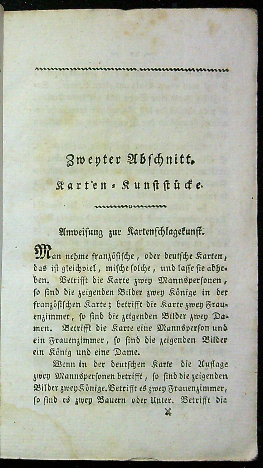 (Clarke-Blind 79; Volkmann 172; Huber-Theiß 2779)br<br>Tištěno švabachem, ve front. prvního dílu mědirytina signovaná Renard, ve druhém dílu frontispis volně vložený (svisle přeložený). I. díl i II. díl s titulem "Neuster grosses Zauberkabinet und Kunstmagazin. Eine vollständige Sammlung der nützlichen und unterhaltendsten magischen, optischen, arithmetischen, ökonimischen, mechanischen, und Karten=Künststücke, mit deutlicher Anweisung dieselben auf die leichteste und unfehlbarste Art auszuführen und vorzustellen. Zum angenehmen Zeitvertrieb in Gesellschaften, zur Winderung des Glaubens an Zaubereyen und zum Nutzen für Hausväter und Künstler, herausgegeben von ..."
