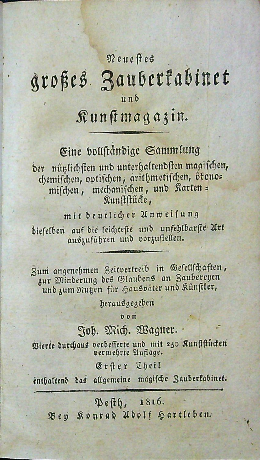 Allgemeines magisches Zauberkabinet. Eine Beschreibung der besten und unterhaltendsten magischen, chemischen, optischen, arithmetischen und mechanischen Kunststücke; deutlicher Anweisung zu denselben. Zum Zeitvertreib und gesellschaftlichen Unterhaltungen für alle Stände sorgfältig gesammelt und herausgegeben von ....