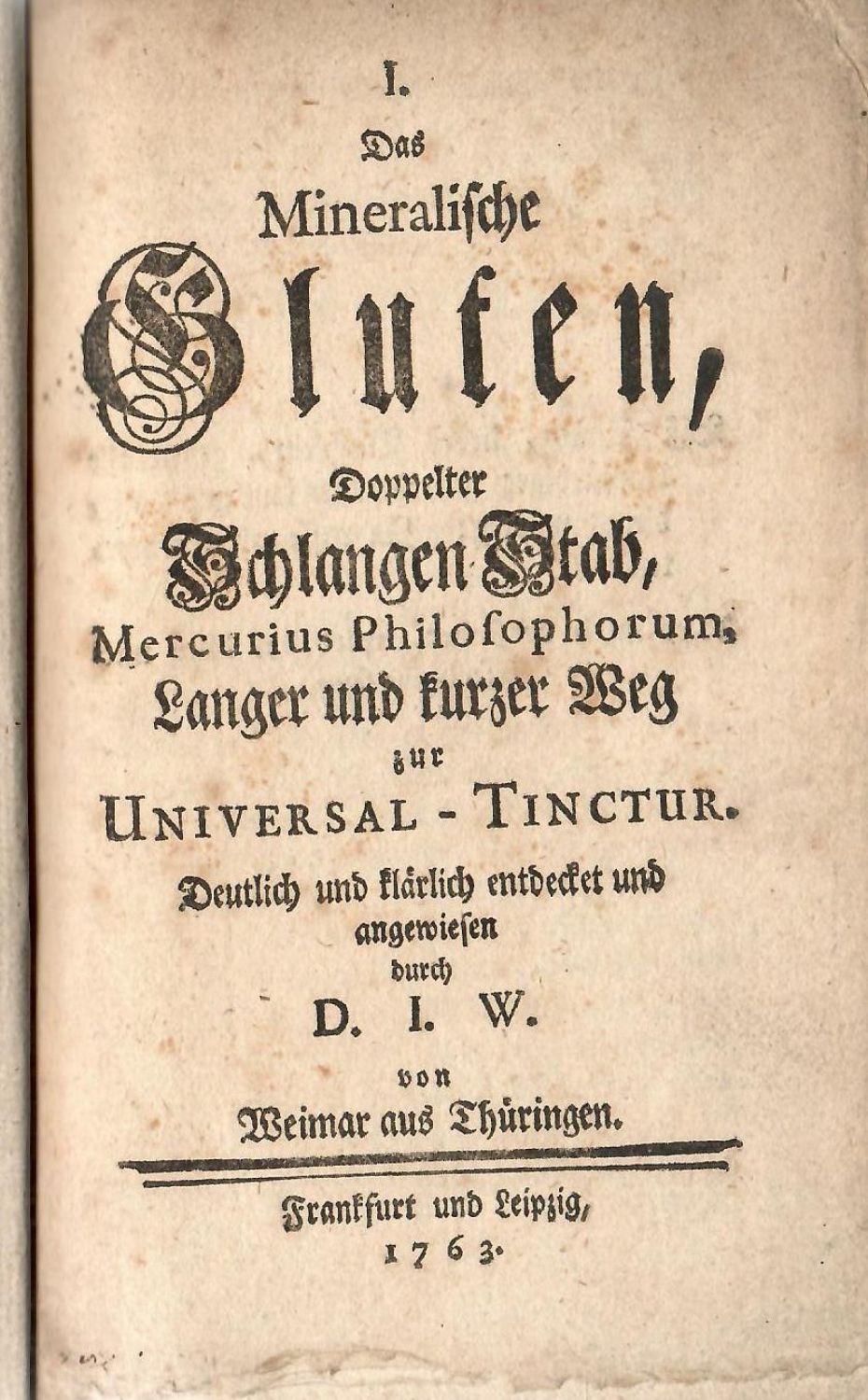 I. Das Mineralische Gluten, Doppelter Schlangen Stab, Mercurius Philosophorum, Langer und kurzer Weg zur Universal - Tinctur. Deutlich und klärlich entdecket und angewiesen durch D. I. W. von Weimar aus Thüringen.