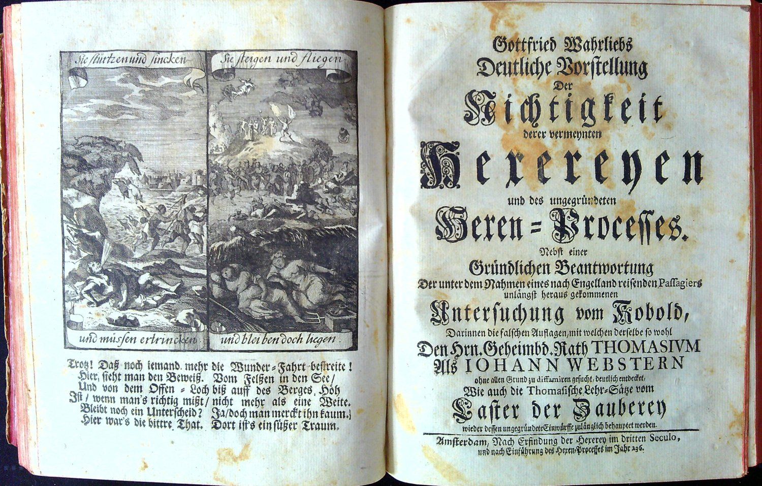 Untersuchung Der Vermieten und so genannten Hexereÿen Worinn zwar zugegeben wird, Daß es an mancherley Betrug und Aeffereyen nicht fehle, auch, daß viele Persohnen von ihrer Melancholischen Phantasie offt gewaltig hinters Licht geführet werden: Im Gegentheil aber die Fabel, daß der Teuffel leibhafftig einen Pact mit den Hexen mache; oder, daß er an den Hexen sauge, und sich fleischlich mit ihnen vermische; oder, daß die Zauberinnen sich in Katzen und Hunde verwandelt, Wetter machen, u.d.g. k#onnen, durchaus geleuguet und umgestossen wird. Dabey auch die Warheit, daß es allerdings Engel und Geister, wie nicht weniger Erscheinungen gebe, eröffnet; hiernechst von der Natur der Stern= und Astral-Geister, und der unleugbaren Würckung der Zaubereyen und Liebes=Träncken, nebst andern geheimen Sachen gehandelt wird. Aus dem Englischen ins Teutsche übersetzt, und nebst einer Vorrede des Hrn. Geheimbden Raths THOMASII, wie auch vollständigen Summarien und Registern herausgegeben.