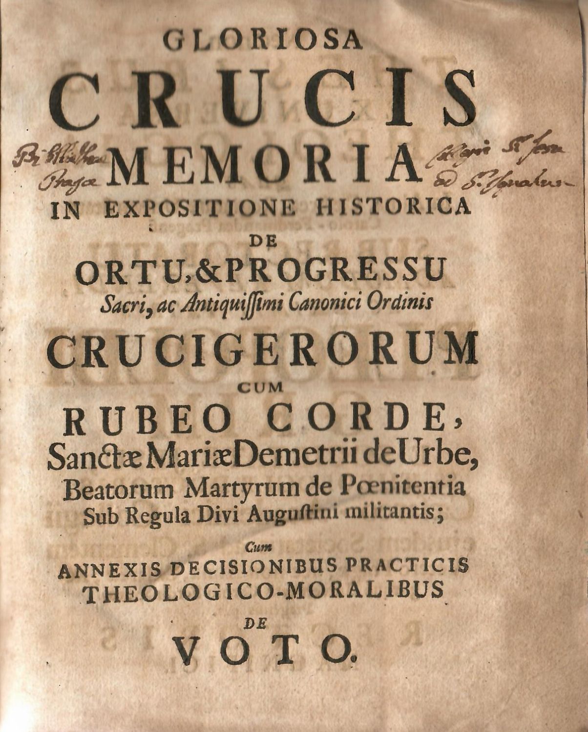 GLORIOSA CRUCIS MEMORIA IN EXPOSITIONE HISTORICA DE ORTU, & PROGRESSU Sacri, ac Anitiquissimi Canonici Ordinis CRUCIGERORUM CUM RUBEO CORDE, Sancte Mariae Demetrii de Urbe, Beatorum Martyrum de Poenitentia Sub Regula Divi Augustini militentis; Cum ANNEXIS DECISIONIBUS PRACTICIS THEOLOICO-MORALIBUS DE VOTO.
