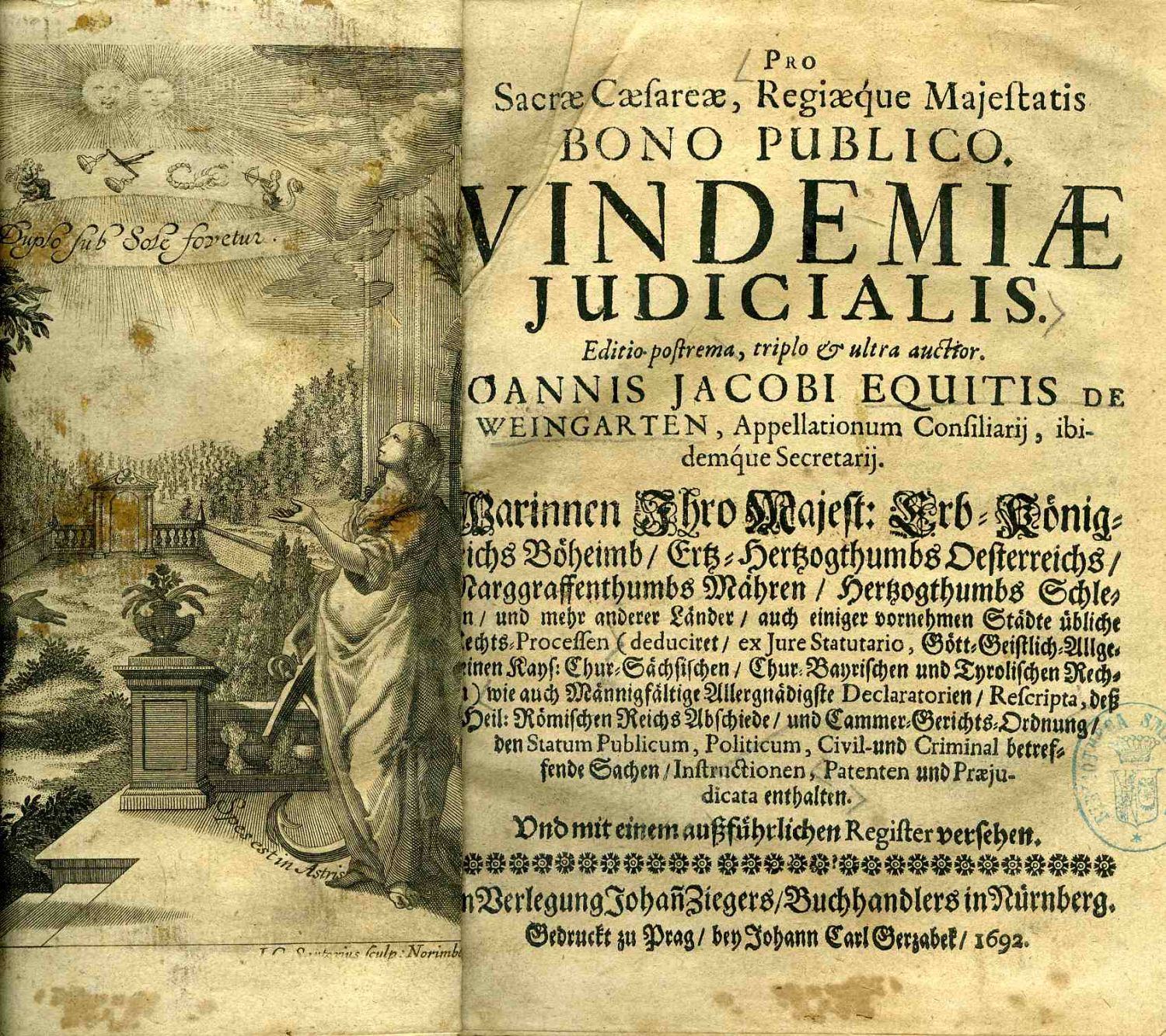 Knihopis 16957; Zíbrt II,352,700; Pumprla 10,5042<br>Německý a český text gotikou, latinský antikvou, z větší části dvou sloupcový tisk, signatury, stránkové kustody, živá záhlaví od sazby oddělená jednoduchou linkou, ornamentální linky, viněty, ozdůbky, plné žaludy, plné iniciálky ve volném prostoru ve výši 2-3 řádků, versálky ve ve stejné výši, konturová iniciálka v ornamentech ve výši 5 řádků, 6 a 8 cípé hvězdičky, abecední ejstřík, errata. - Knižní blok šitý třemi vazy, přelepený pouze bílým papírem, vpředu věcný název tužkou, červeně stříkaná ořízka; listy průběžně mírně zahnědlé či s hnědými skvrnkami, front. při okrajích zašpiněný a s hnědými skvrnami, při vnitřním okraji všitý do knižního bloku. Na titulním listu staré razítko zámecké knihovny ve Smečně.<br>Johann Jacob rytíř Weingarten (1629 Chomutov - 1701 Praha) vystudoval práva a filosofii na pražské universitě, byl soudcem Maltézské jurisdikce na Malé Straně, od roku 1677 prvním syndikem malostranským a městským radním, 1689 ustanoven titulárním královským apelačním radou. Autor četných právnických děl, která psal především v německém a latinském jazyce.
