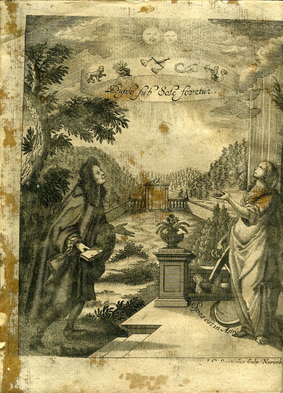 | Ilustrace: | Mědirytinový front. 168 x 137 mm (autor s knihou a postava Naděje v barokní zahradě prosvícené dvojitým sluncem, v paprscích slunce oválný zvěrokruh s některými nebeskými znameními), sign. "I. F. Necker delin., I. C. Sartorius sculp. Norimbergae". |