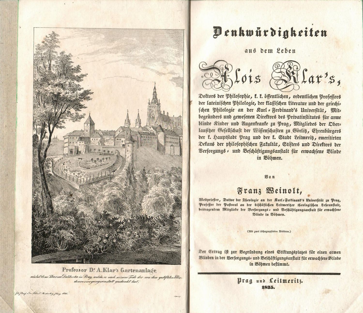 Denkwürdigkeiten aus dem Leben Alois Klar´s, ... Der Ertrag ist zur Begründung eines Stiftungsplatzes für einen armen Blinden in der Versorgungs- und Beschäftigungsanstalt für erwachsene Blinde in Böhmen bestimmt.