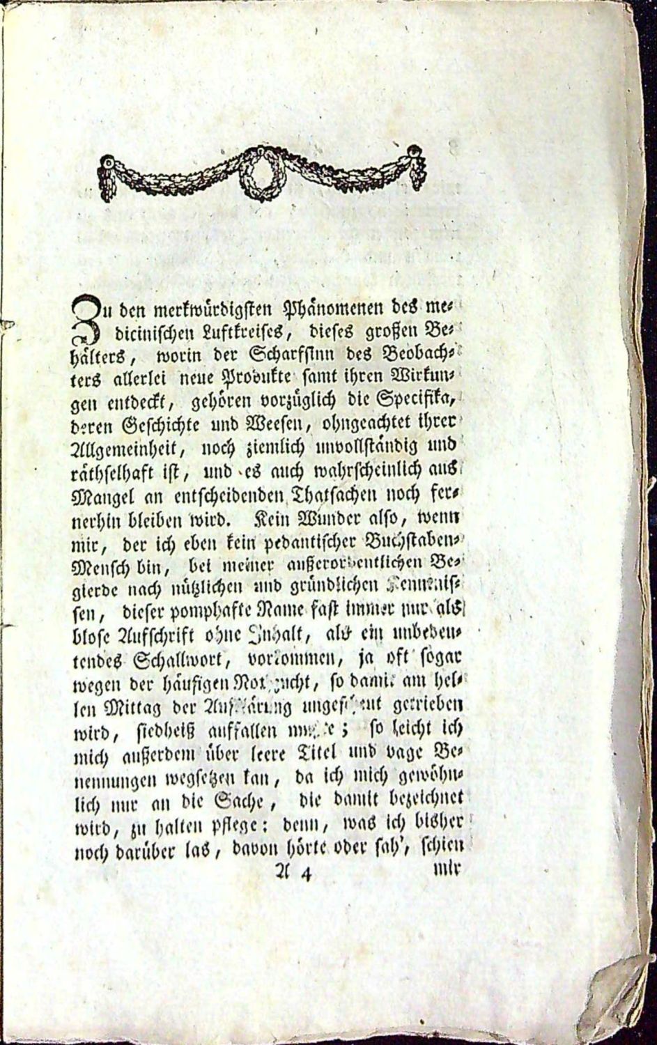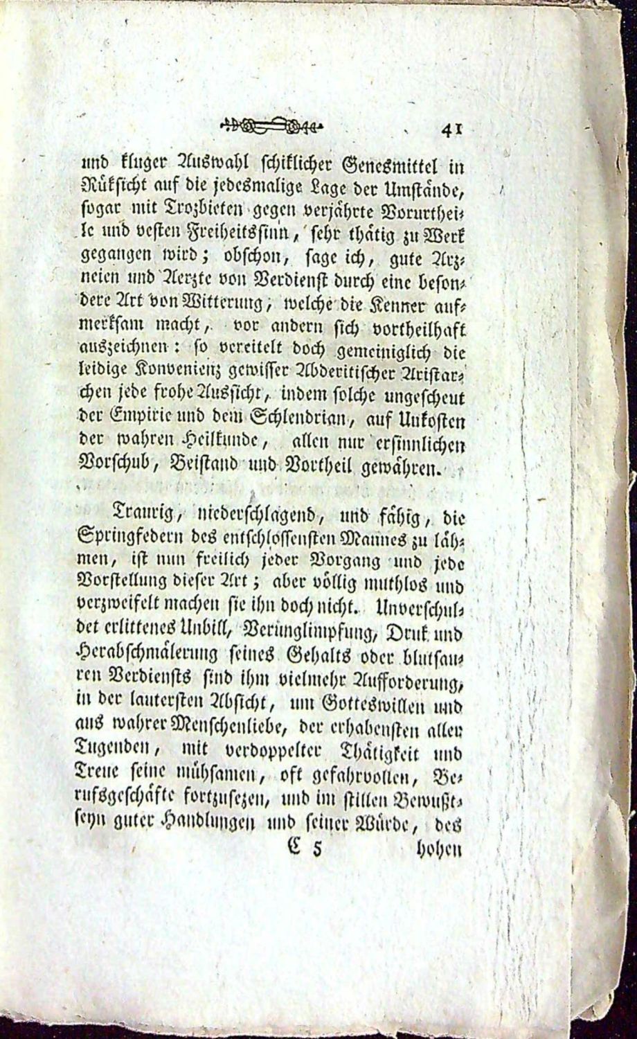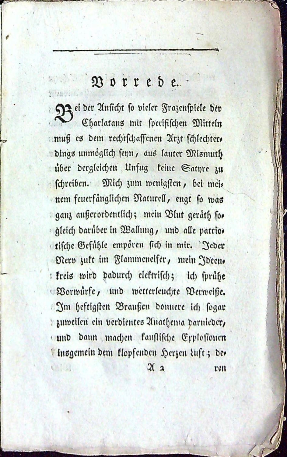 Holzmann-Bohatta IV,3159; Ferchl str., 575<br>Tištěno švabachem, uprostřed horního okraje stran mizící ozdobná tyč, na tit. listu drobná rokoková vinětka, koncová mizící ozdobná lišta. Knižní blok nerozřezaný a zčásti neoříznutý. Papír při vnějším okraji lehce pomačkaný.<br>Erasmus Ludwig Wernberger (1747 Stier-Höfstetten u Lankheimu - 2.10. 1795 Windsheim) od roku 1778 druhý městský lékař v Erlangenu - Windsheimu, roku 1789 byl přijat do Německé akademie přírodních vědců Leopoldina a roku 1794 byl jmenován královským pruským dvorním radním. Nabízenou knížku publikoval anonymně neboť v ní kritizuje svoji profesi a mnohé kolegy označuje za šarlatány (řada jeho výhrad nepozbyla platnosti dodnes). Paul Usteri v knize "Repertorium der medicin. Litteratur des Jahres 1789" vydané v Zürichu roku 1790, na straně 246 o nabízené knížce píše: "charakteristika náladových, šibalských, hloupých, ale přesto vzdělaných šarlatánů, kteří jsou zde rozděleni do šesti tříd - podvodníci, galantní, neotesaní, zhýralí, pokrytečtí, pedantští ...".